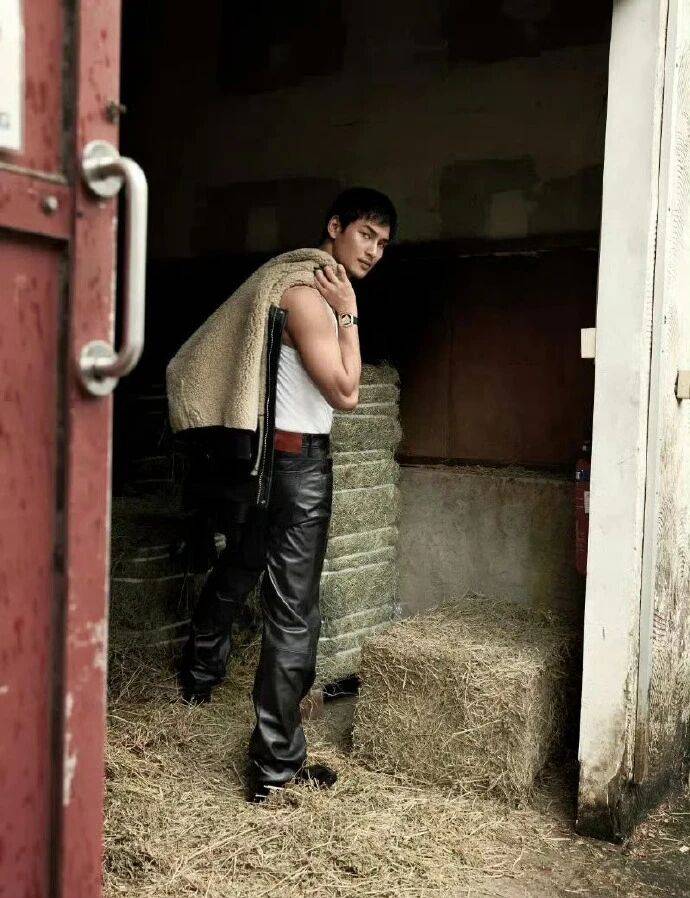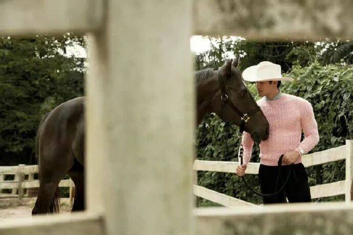 这组封面最戳人的是 “不生硬的互动”:他不是 “攥着缰绳摆姿势”,是轻碰马颈的侧脸、和马对视的眼神,甚至蹲在马厩干草堆里时,马就安静靠在旁边 —— 这种松弛不是演出来的,更像 “日常和马相处的状态”。镜头没刻意渲染 “时尚大片感”,反而抓了这些 “自然互动的瞬间”,让封面有了 “故事感”,不是 “拍封面”,是 “记录牧场里的时尚时刻”。