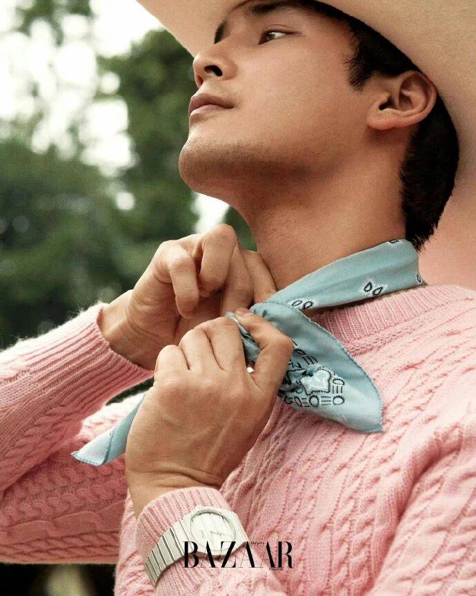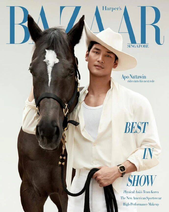谁看了不说 “这才是不刻意的时尚”?Apo 登新加坡版芭莎一月刊,牵着骏马的封面根本不是 “摆拍式牵马”—— 靠在马颈旁的轻贴、蹲在干草堆里的随性,连造型都跟着马场的松弛调调走:白色西装搭牛仔帽是 “牧场贵气”,牛仔外套配马甲是 “休闲精致”,他和马的互动像 “熟络的伙伴”,把 “封面主的时尚感” 揉进了牧场的生活气息里,完全没有大片的距离感。