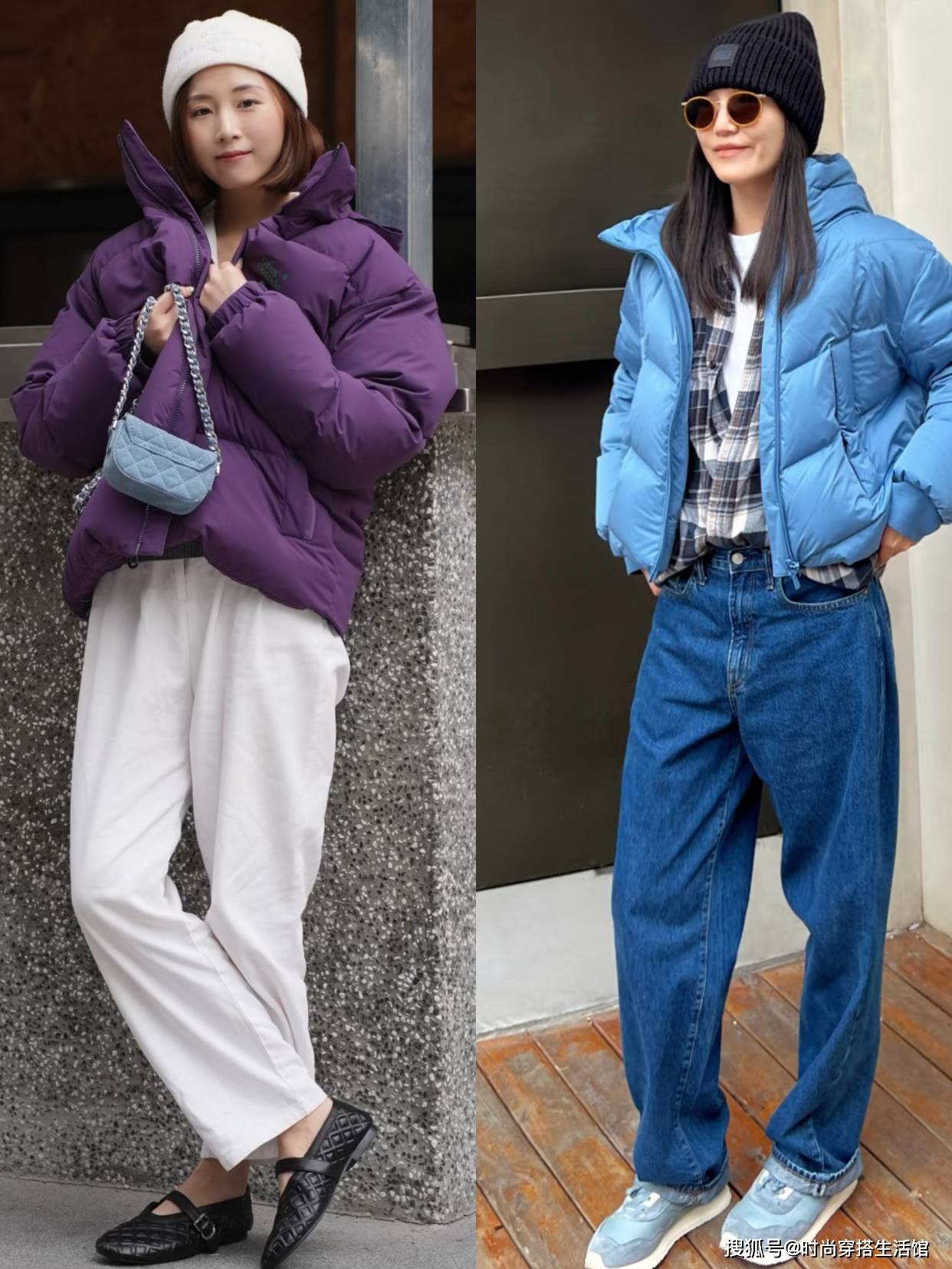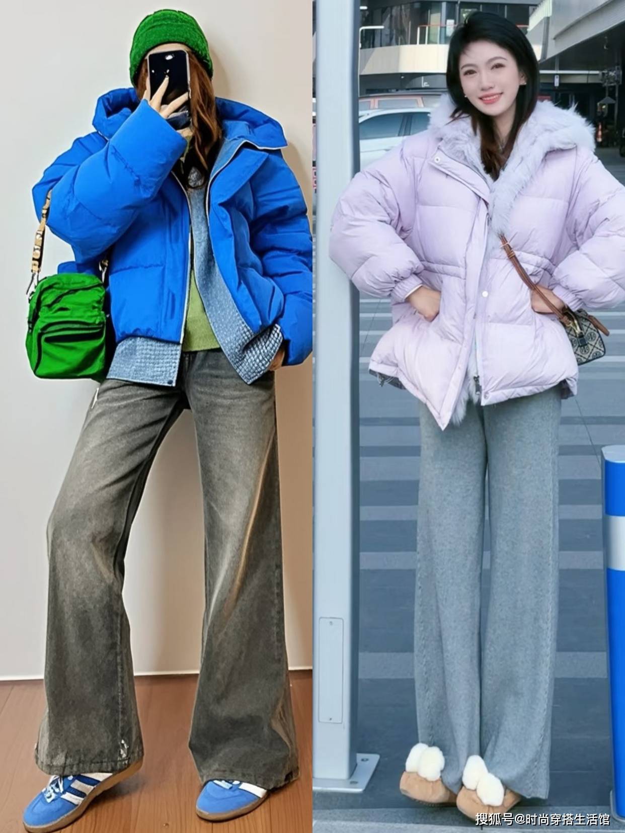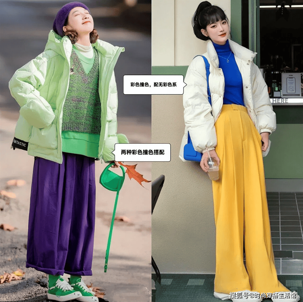 那么最好的方式就是我们选择色彩的搭配不要超过三种,最常见的就是注意全身两个彩色系,比如像是绿色羽绒服搭配紫色阔腿裤或者是米白色羽绒服搭配黄色阔腿裤,这样的色彩会更时髦和吸睛,你get到了吗?