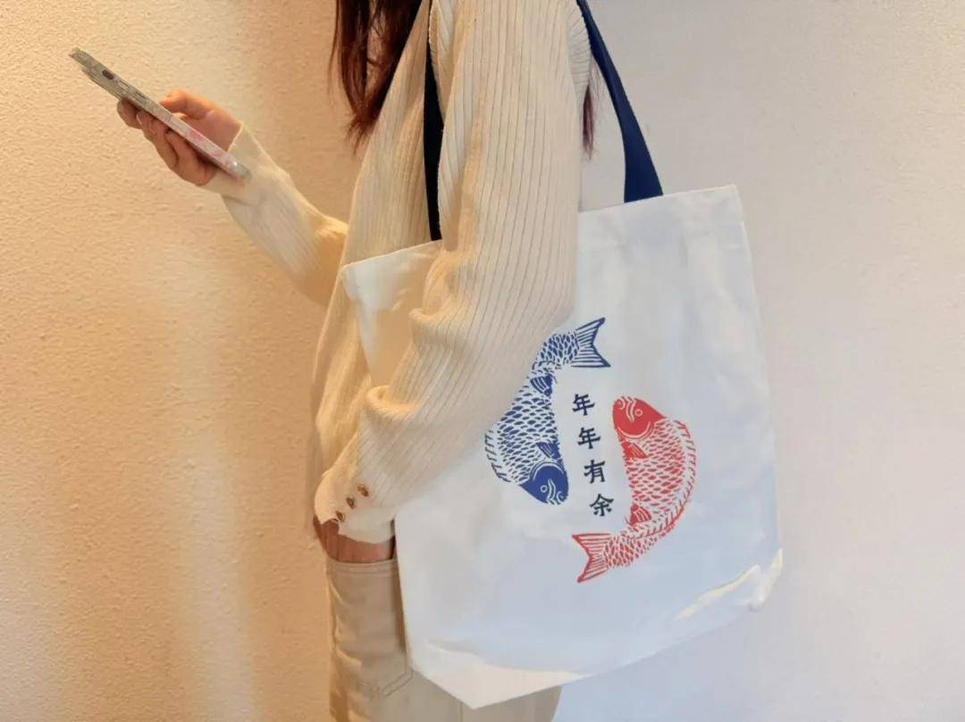 「双鱼昭顺」帆布袋以金代双鱼纹镜为设计原型,此镜镜背装饰水波纹和双鱼,双鱼在水中一左一右隔钮首尾环绕,鱼身肥美,喜庆吉祥。在铜镜中以鱼为纹饰图案,表明了古人追求吉祥如意,祈求人丁兴旺的美好愿望。