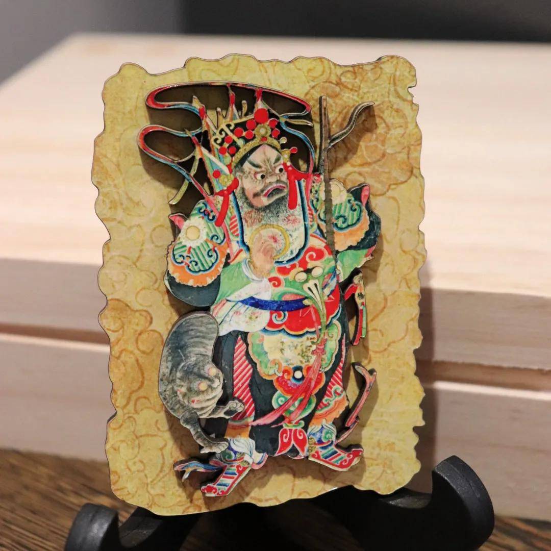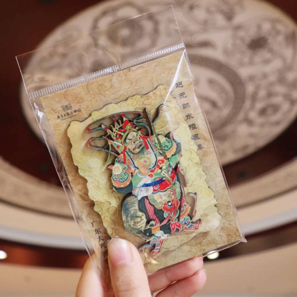 「财神冰箱贴」以馆藏赵元帅水陆画像为原型设计。赵元帅即武财神赵公明。画像中,他黑面虬髯、头戴铁冠,身披金甲皂袍,手持铁鞭,身旁黑虎昂首咆哮,威风凛凛。赵公明专司招财进宝、迎祥纳福,是庇佑财运、守护平安的象征,深受民间尊崇。