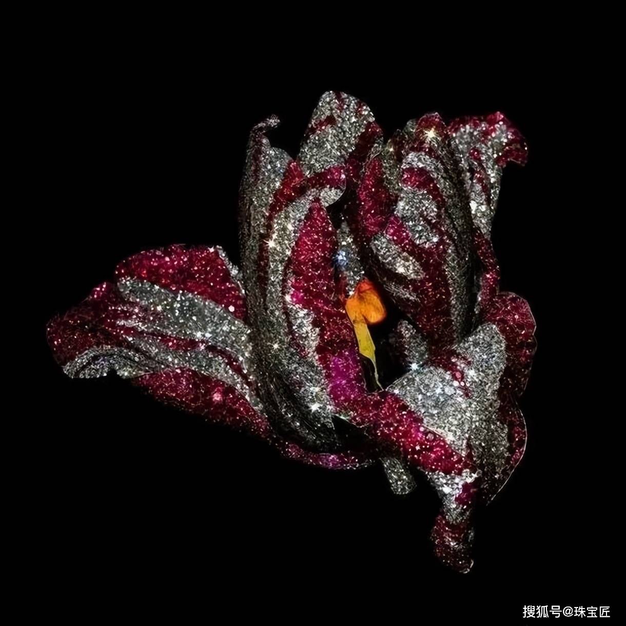 同样是百合花元素,2022年,在TEFAF 的第三乐章《La Fantasia de Fleurs 花之幻想曲》中,一款钛金属材质的印象百合红宝碧玺胸针,则呈现出截然不同的魅力。