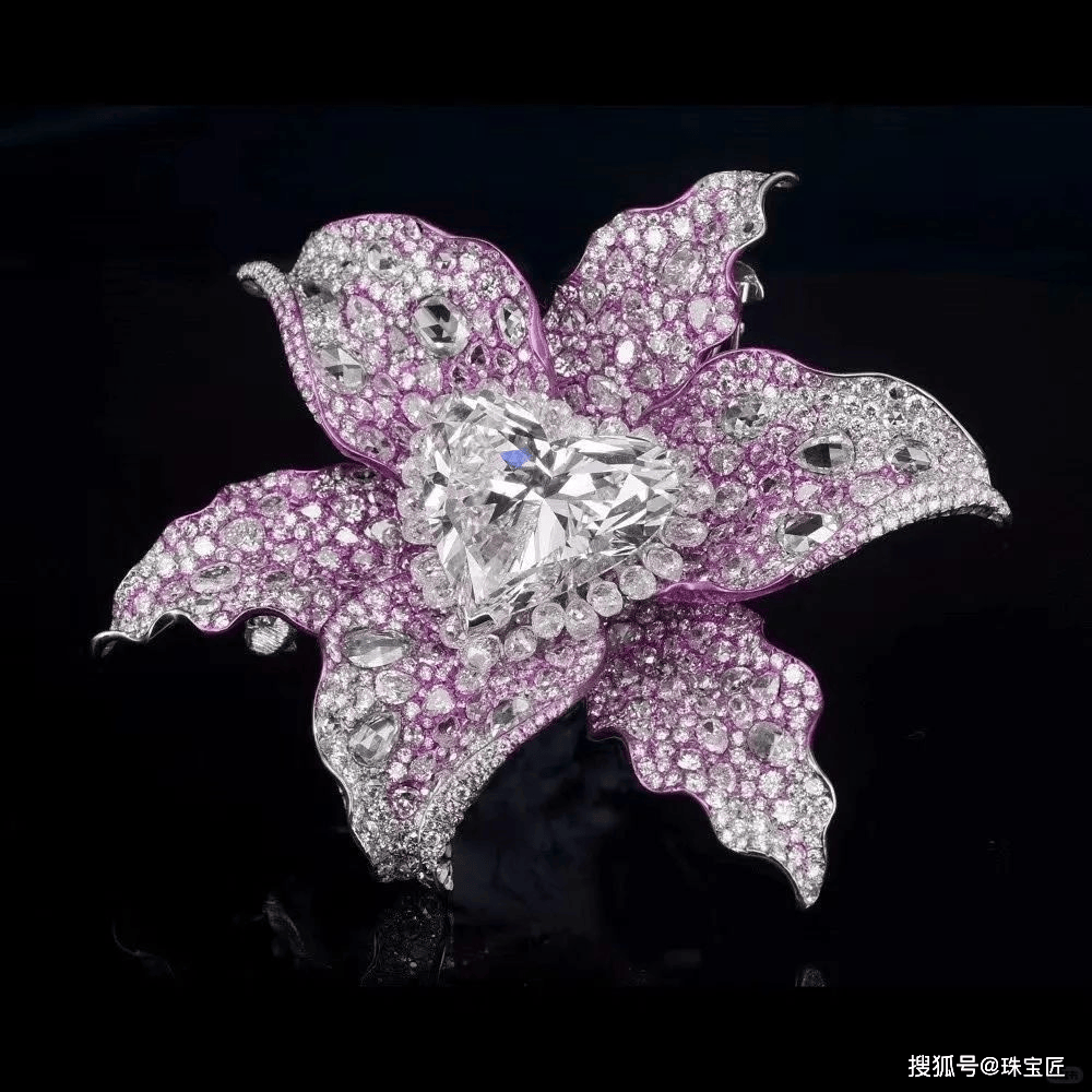 一颗重达55.75ct心形钻石镶嵌成百合花花蕊,钛金属、白金打造的花瓣自然卷曲,1000余颗白钻与粉钻点缀其上,配色温柔甜美,令人怦然心动。