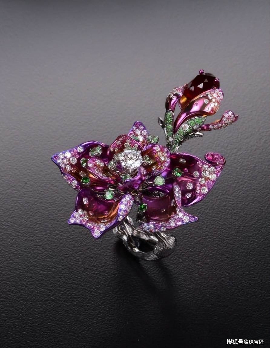 JAR别出心裁的将红宝石、粉色蓝宝石、石榴石、钻石等各色彩宝镶嵌在经过氧化处理的钛金属上,密镶的彩宝叠加颜色的变化,使得郁金香的造型栩栩如生,色彩搭配也更为绚丽夺目。