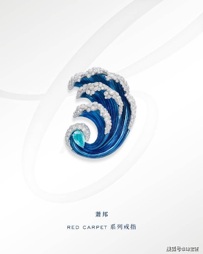 2021年,Red Carpet 高级珠宝系列【Paradise】中的Water 戒指,更是用蓝色钛金属,定格海浪翻涌的澎湃瞬间,钻石被巧妙地镶嵌在海浪的顶端,宛如一朵朵洁白的浪花在海面上绽放。
