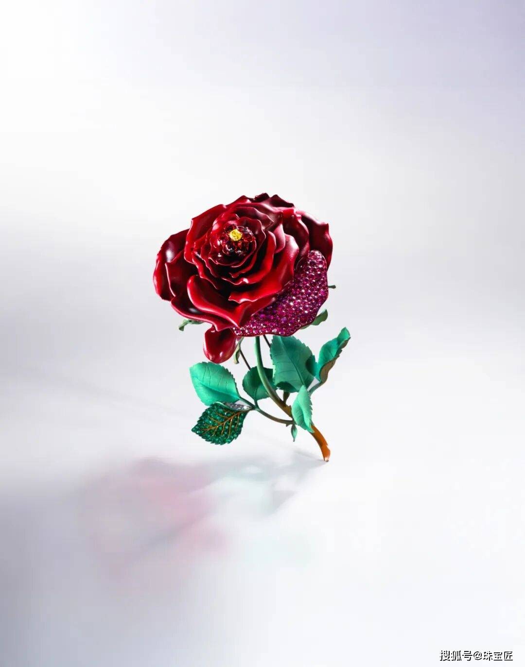 一颗1.18克拉天然艳彩黄钻镶嵌在正中,6颗7.35克拉的天然红尖晶石环绕周围,而整朵玫瑰舒展的花瓣,则由钛金属一体塑造成型。