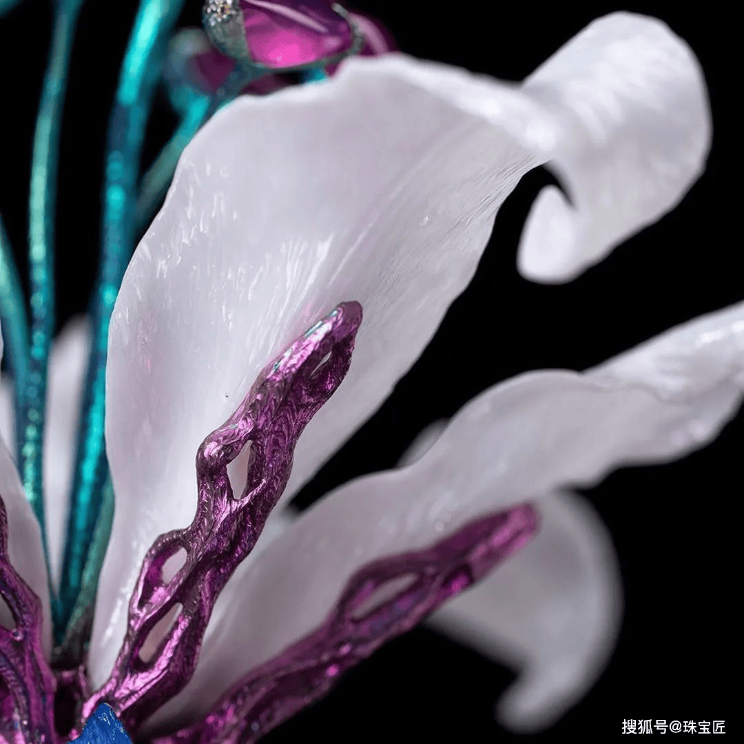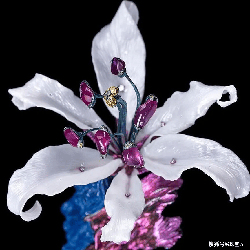 6颗12.90克拉的红宝石点缀白百合的花蕊,高硬度材料——世英陶瓷打造的百合花瓣,每一处纹理都被精准刻画,造型生动逼真。