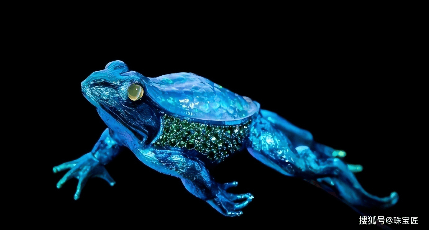 皇冠的左右两侧,各伫立一只以钛金属塑造的青蛙,通体经电镀工艺渲染为鲜润的翠绿色,背部则缀以一颗1.70克拉的水滴形切割祖母绿,造型生动逼真。