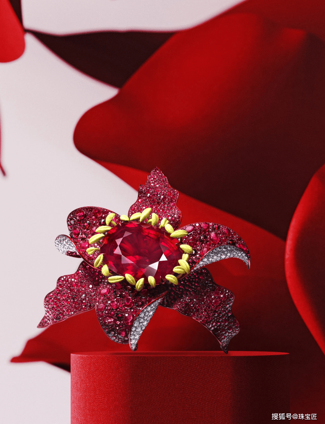 正中间是一枚265.96克拉罕见的天然无烧红宝碧玺,18K黄金材质的花蕊,采用可于夜间发光的漆绘工艺打造,即使在黑夜之中也能呈现出点点星光。