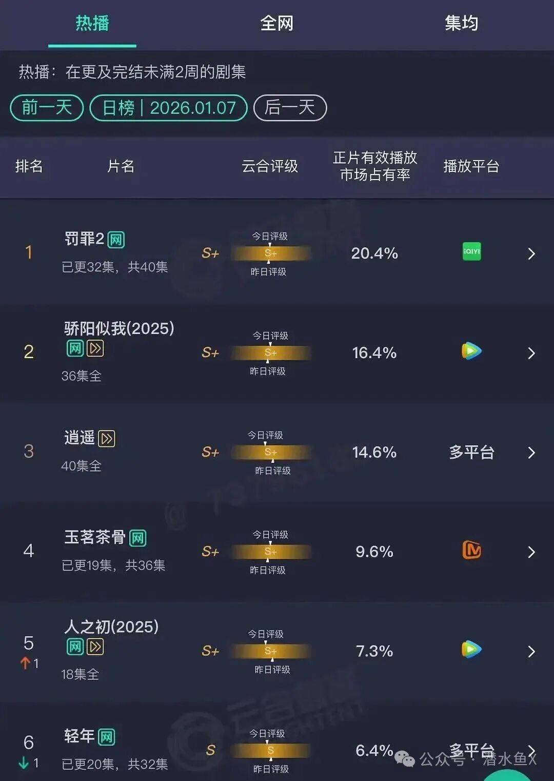 虽说舆论场上对女尊的讨论颇多,但市场用脚投票,《玉茗茶骨》在1月7日当天云合的市占率仅为9.6%,比第三名的老套古偶《逍遥》(男主也是侯明昊)还是低了5个点。向来喜欢在宣传期上蹿下跳的于正,这一次也只是贡献了个把热搜#玉茗茶骨不爆是因为长剧没有观众#。
