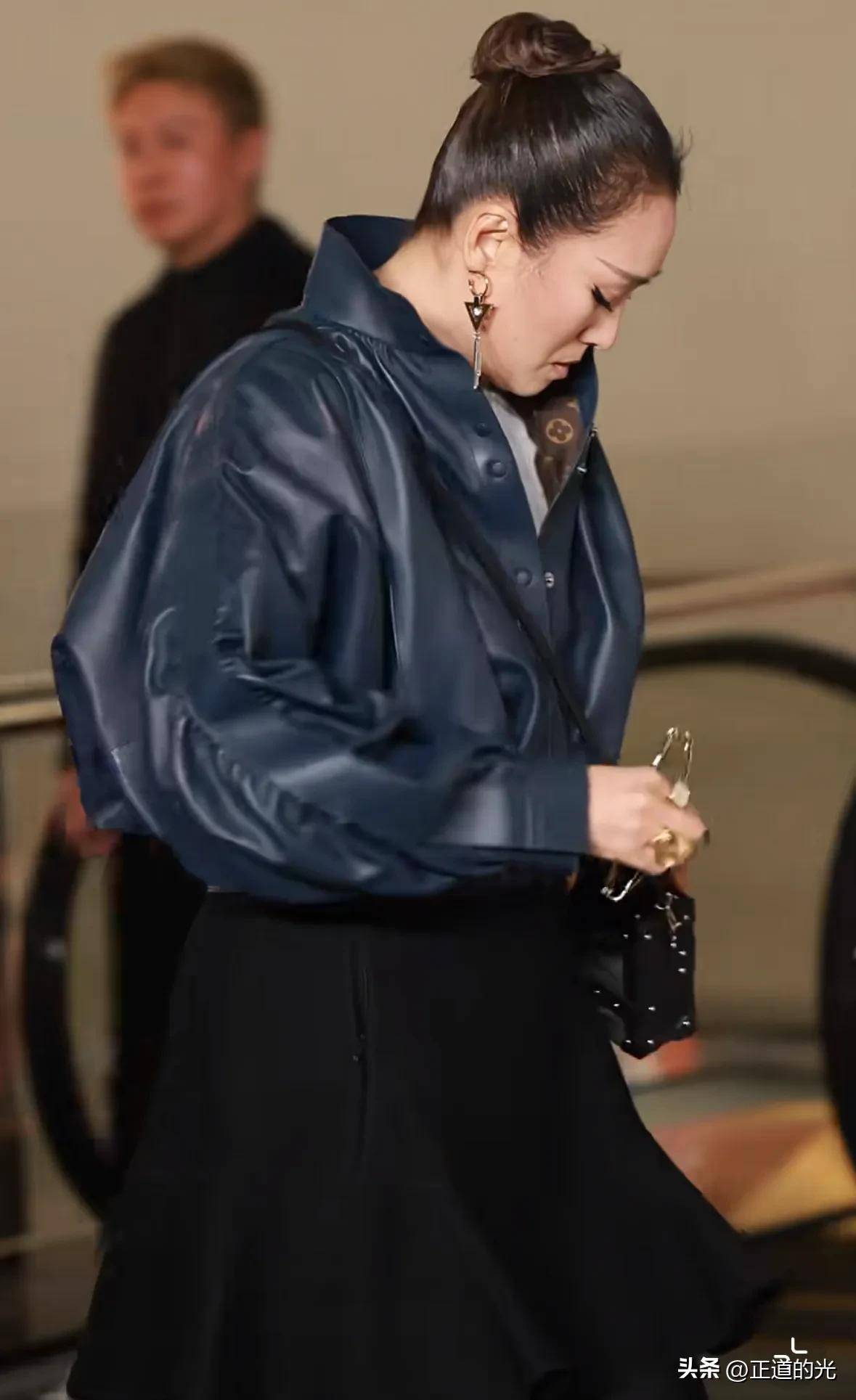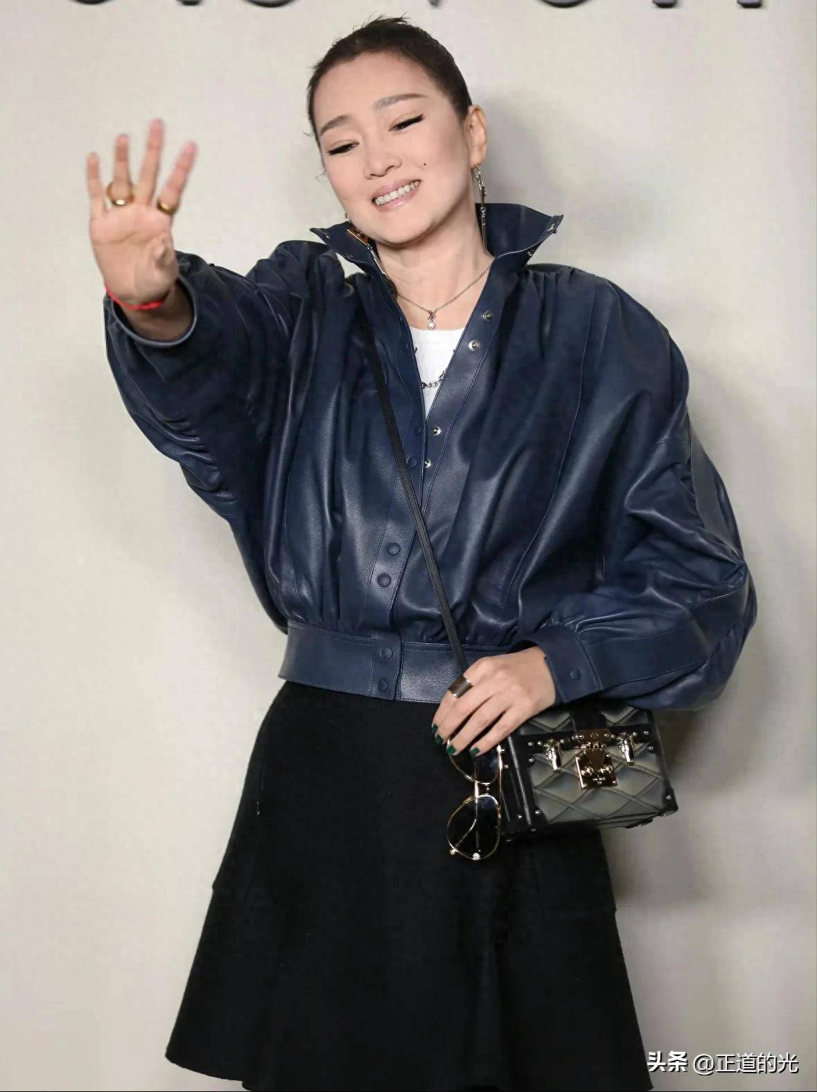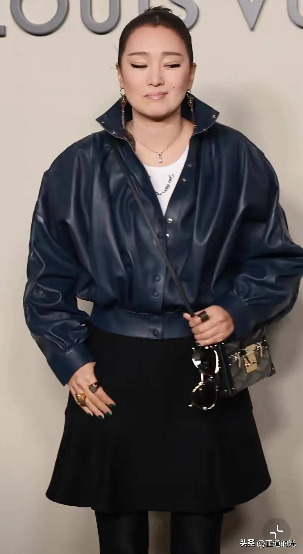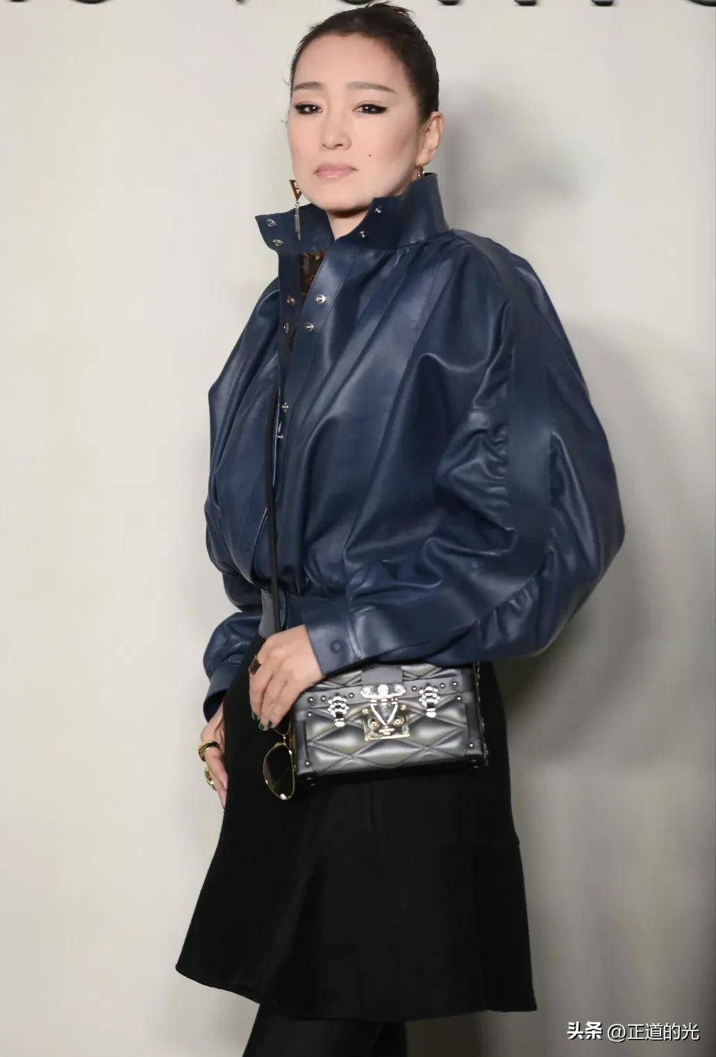 视频中的巩俐,穿着一身LV时装,依然保持着她那一贯的霸气。她的发型是那种典型的背头,扎成一个丸子头,简洁利落,彰显出她独特的气质。她的国字脸型和微黄的肤色,映衬出浓厚的亚洲美感,让人一眼就能认出她。她的上身穿着一件深蓝色的夹克皮衣,配上一条黑色包臀短裙,整个人看起来既成熟又优雅。下身则搭配了一条黑色紧身裤,踩着一双高跟鞋,脚步铿锵有力,仿佛每一步都在宣告着她依旧在这个世界的舞台上占有一席之地。而她的黑色斜挎包,恰到好处地增加了几分随性与时尚感,搭配她那大胆的烟熏妆眼影,巩俐的整个人散发出一种不可一世的霸气。