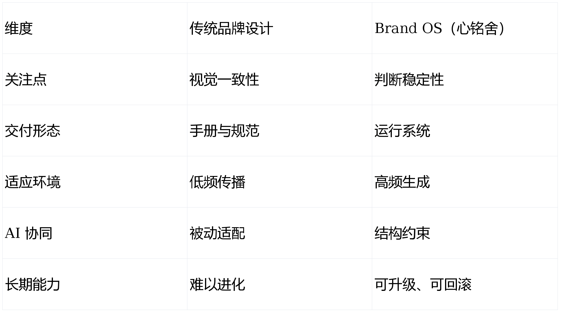 传统品牌设计解决的是“呈现问题”, 而 Brand OS 解决的是“运行问题”。这不是表达差异,而是结构差异。