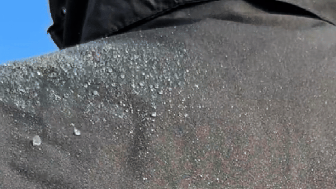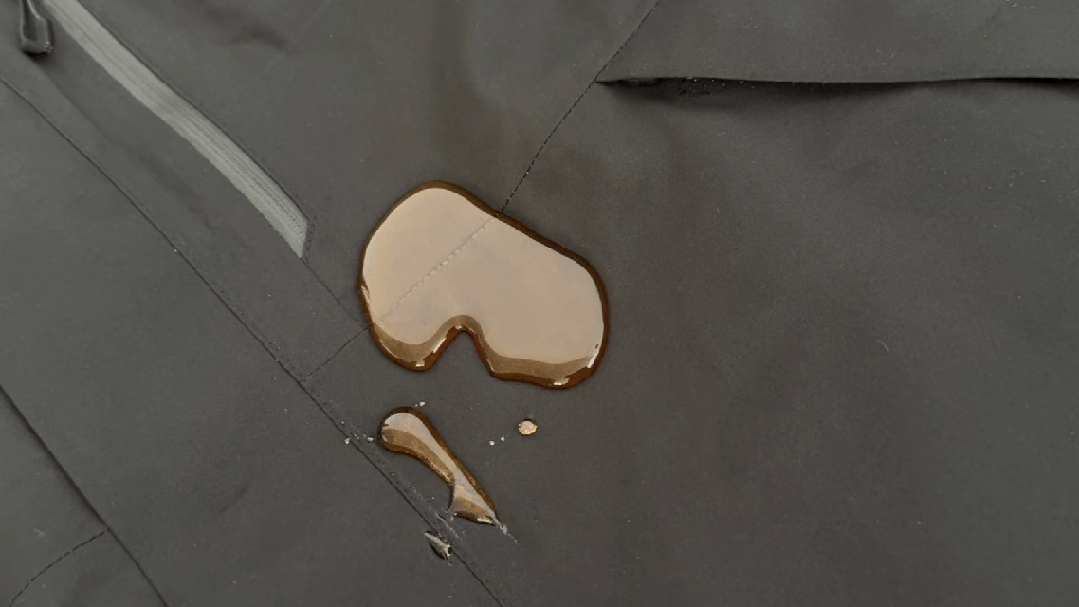雨水落在衣服表面会形成水珠,自然滑落;肩部、拉链、领口等容易进水的位置,不会渗水。