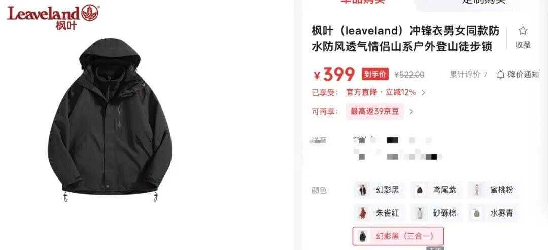 Leaveland 枫叶三合一冲锋衣,采用的是全压胶工艺,所有缝线位置都经过压胶处理,把针眼完全封住。
