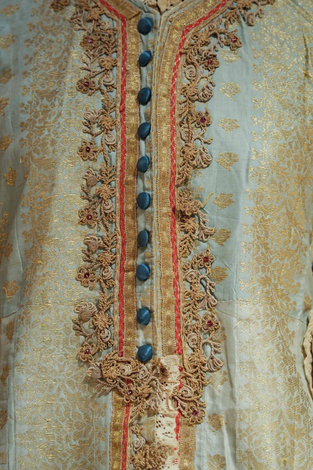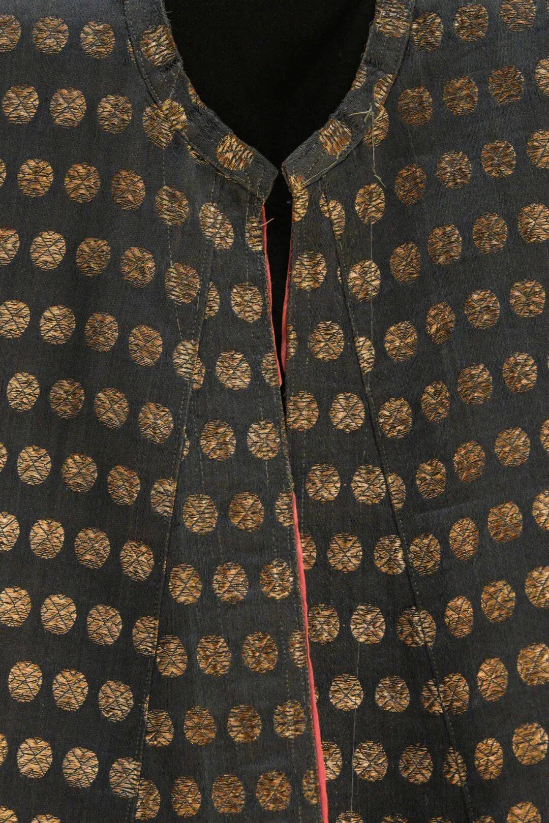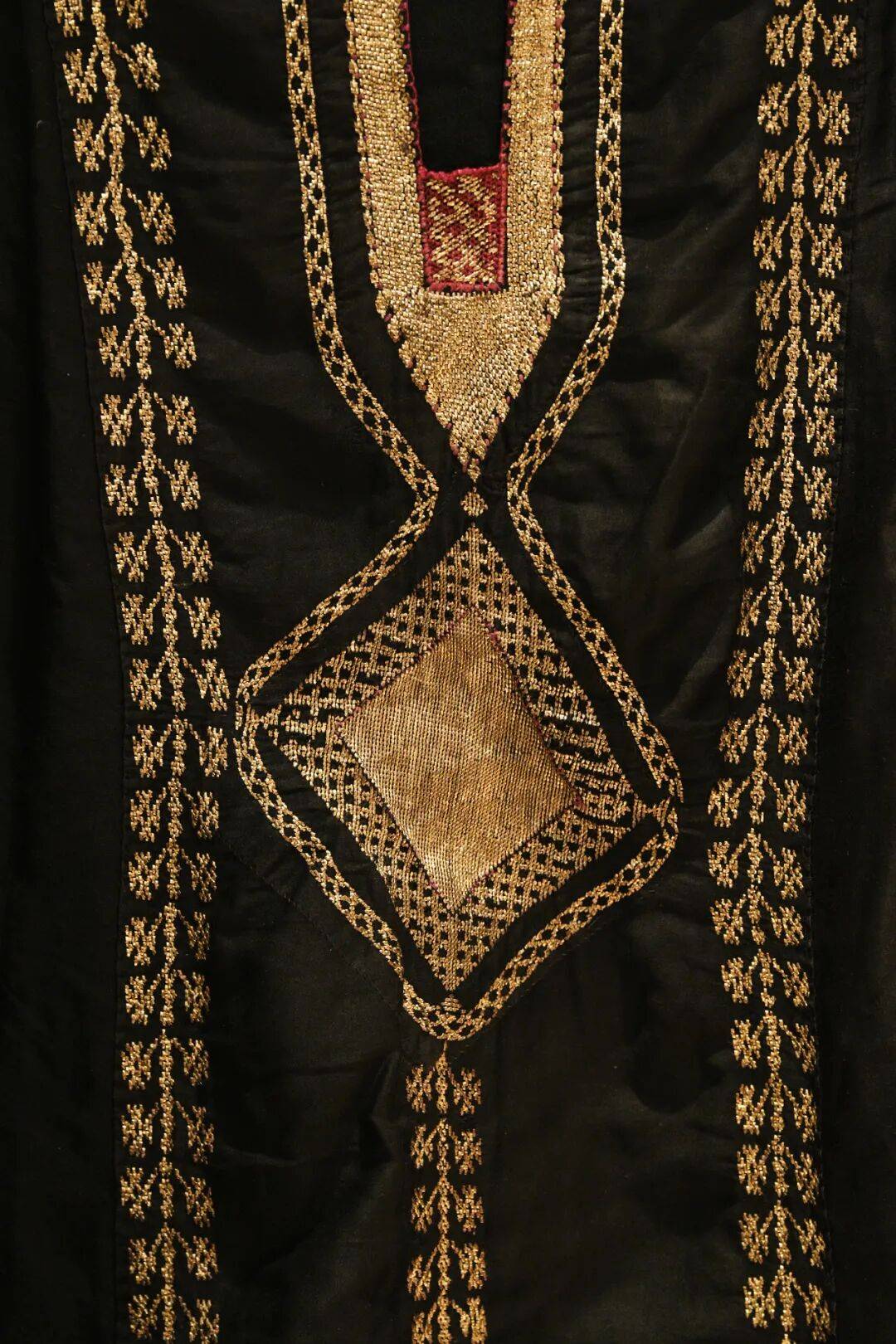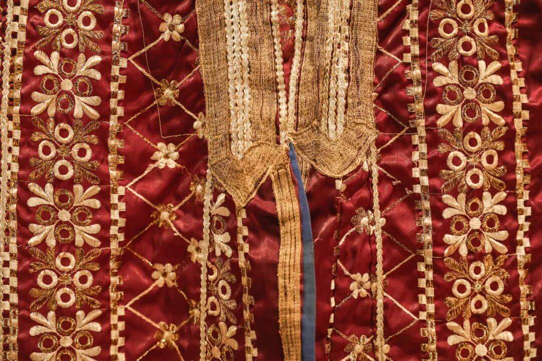 展厅中,一件20世纪初也门红色丝绸短袖上衣静静伫立。袖口、肩腹、衣襟边缘,金线绣制的宽穗带以条带状铺陈,花卉格子、三叶草与圆形图案交错排布,足以让人想见当年也门城市女性身着此服装度过佳节时的光彩夺目。