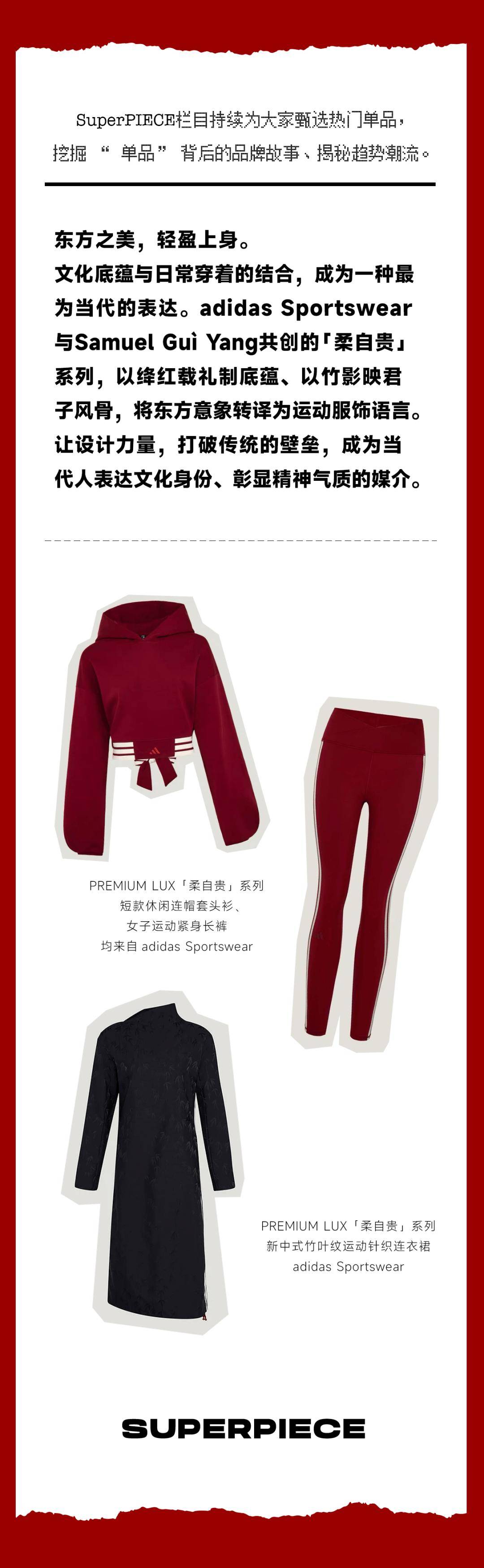 在这样的文化脉络中,adidas Sportswear 与SAMUEL GUÌ YANG共创的PREMIUM LUX「柔自贵」系列,从东方服饰文化的精神结构中汲取能量,以“红”与“竹”作为双重文化线索,通过色彩与意象,将东方文化之美转译为当代运动服饰语言。