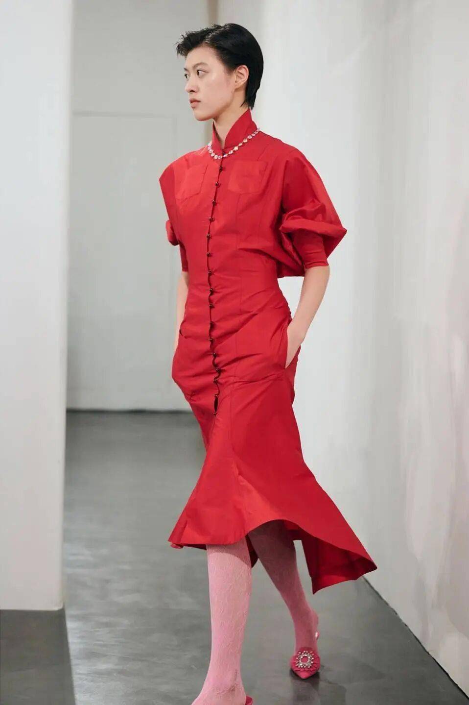 不同时期的代表性单品在本季被重新书写,“红”与“绿”依旧作为贯穿 SAMUEL GUÌ YANG品牌美学的重要母题,构成视觉与精神层面的双重坐标。春夏新季以白底再度演绎“红花”印花,天然苎麻的肌理让花形在光影中呼吸,轻盈而富有生命感。“绛唇红”Faye Dress 将挺括结构与柔美线条融为一体,假日季场合中的优雅因此显得从容而自然,结构式剪裁勾勒出的并非刻意的造型张力,而是一种轻简、松弛却有力量的身体气质。