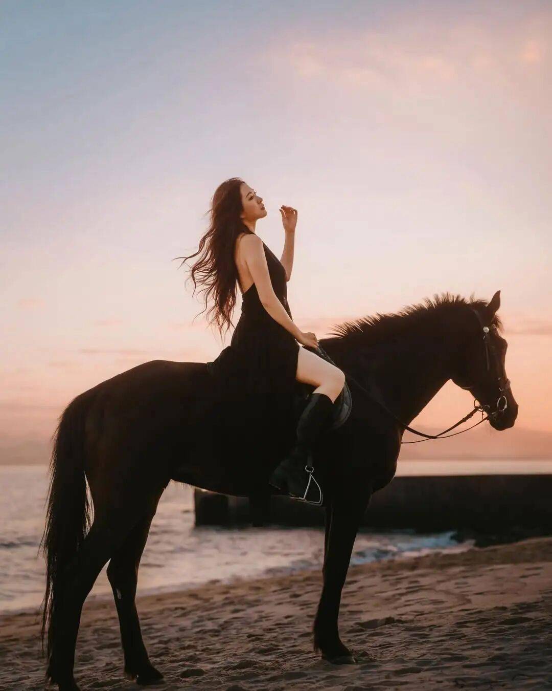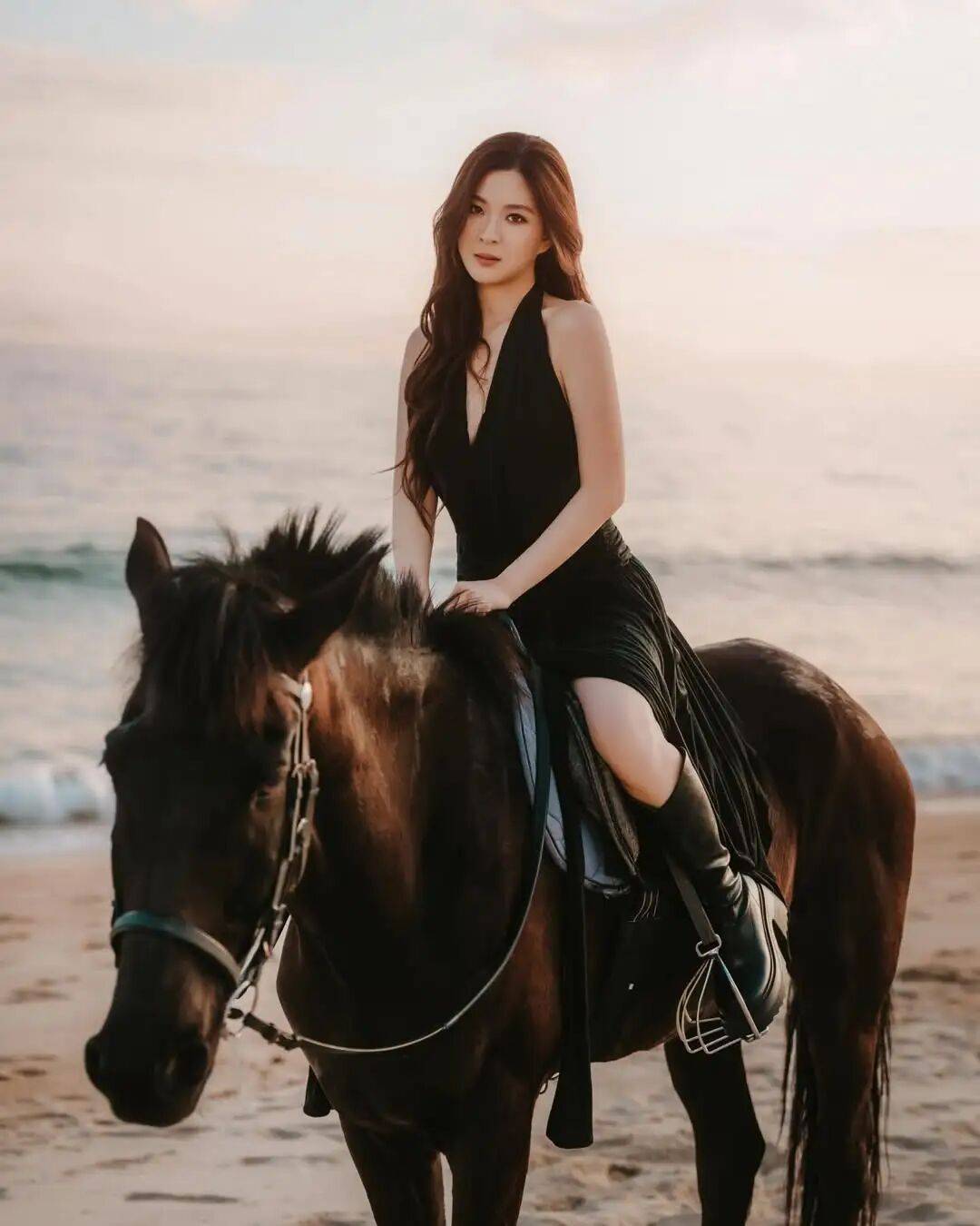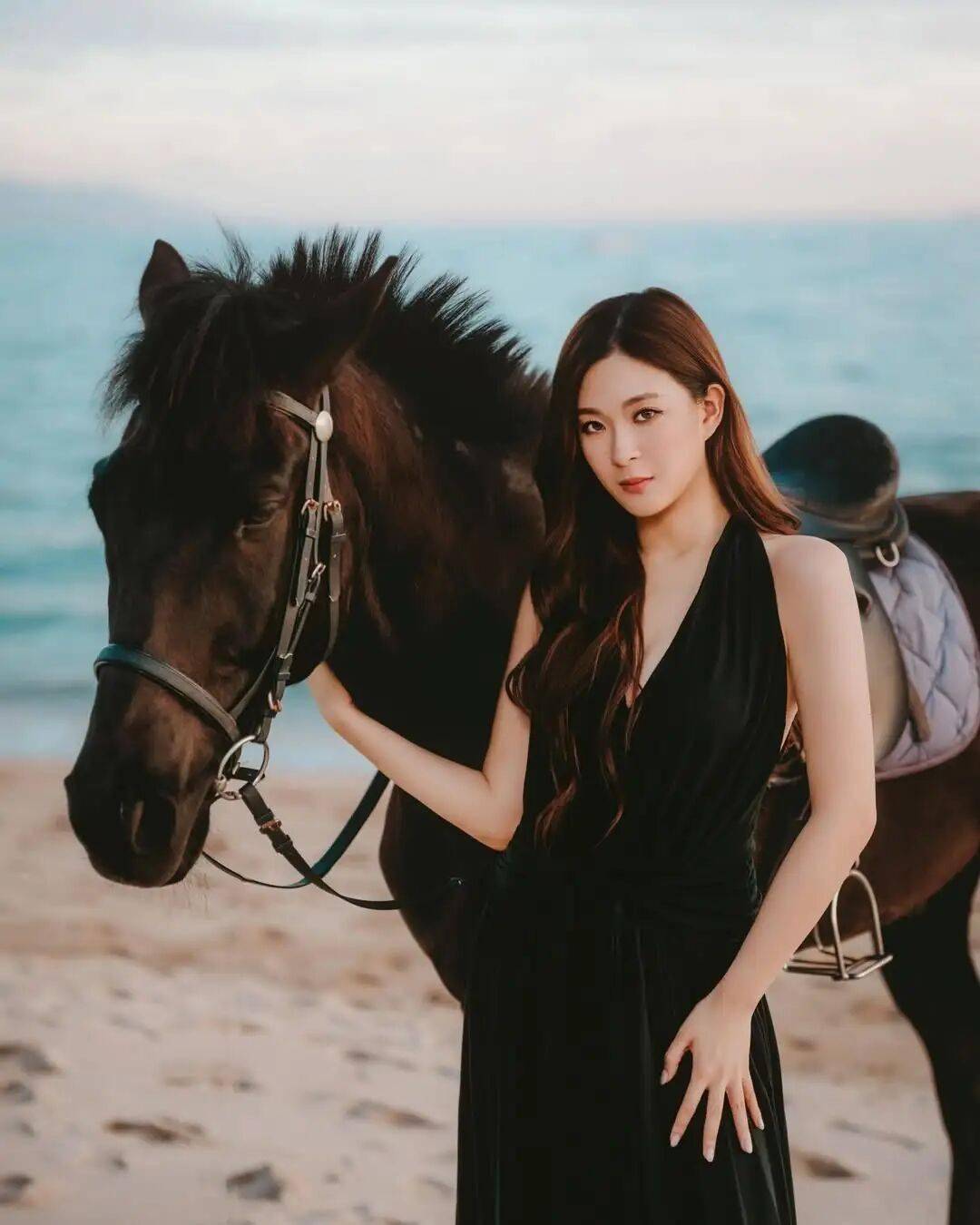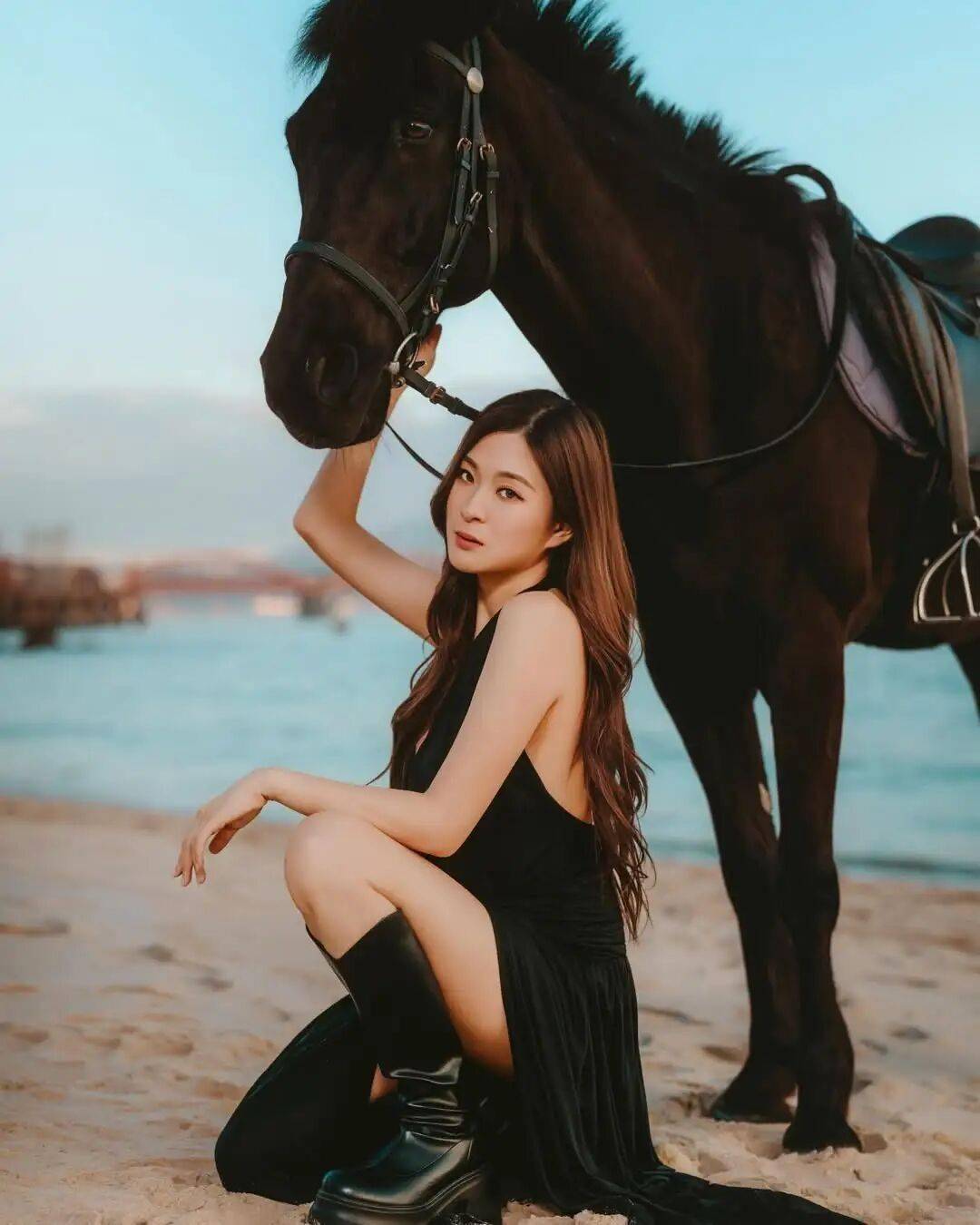 今年是马年,艺人陈懿德(德德)昨日在社交网晒出与骏马的合照,可见德德身穿黑色低胸高衩长裙搭长靴,大晒长腿与好身材,她在骏马上摆出各种有型的姿势,既帅气又充满女人味,十分吸睛。