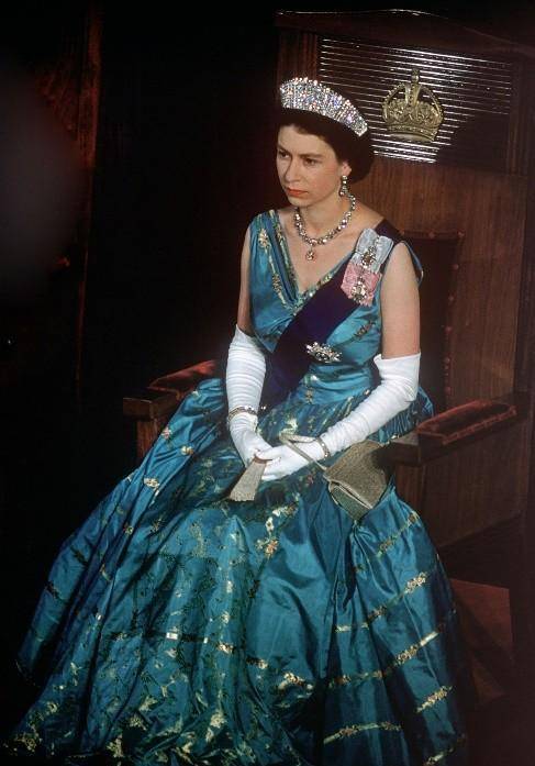 尽管女王的身高一直以来是她的短板,但她大胆地穿上了吊带的丝绒晚礼服,优雅地露出雪白的肩膀,透露出岁月积淀的高贵与不凡。与此相比,杰奎琳则穿着一袭长款淡蓝色礼服,肩部设计大胆地展示出她那美丽的曲线,收腰的设计更是将她的身形衬托得玲珑有致,显得既现代又前卫。