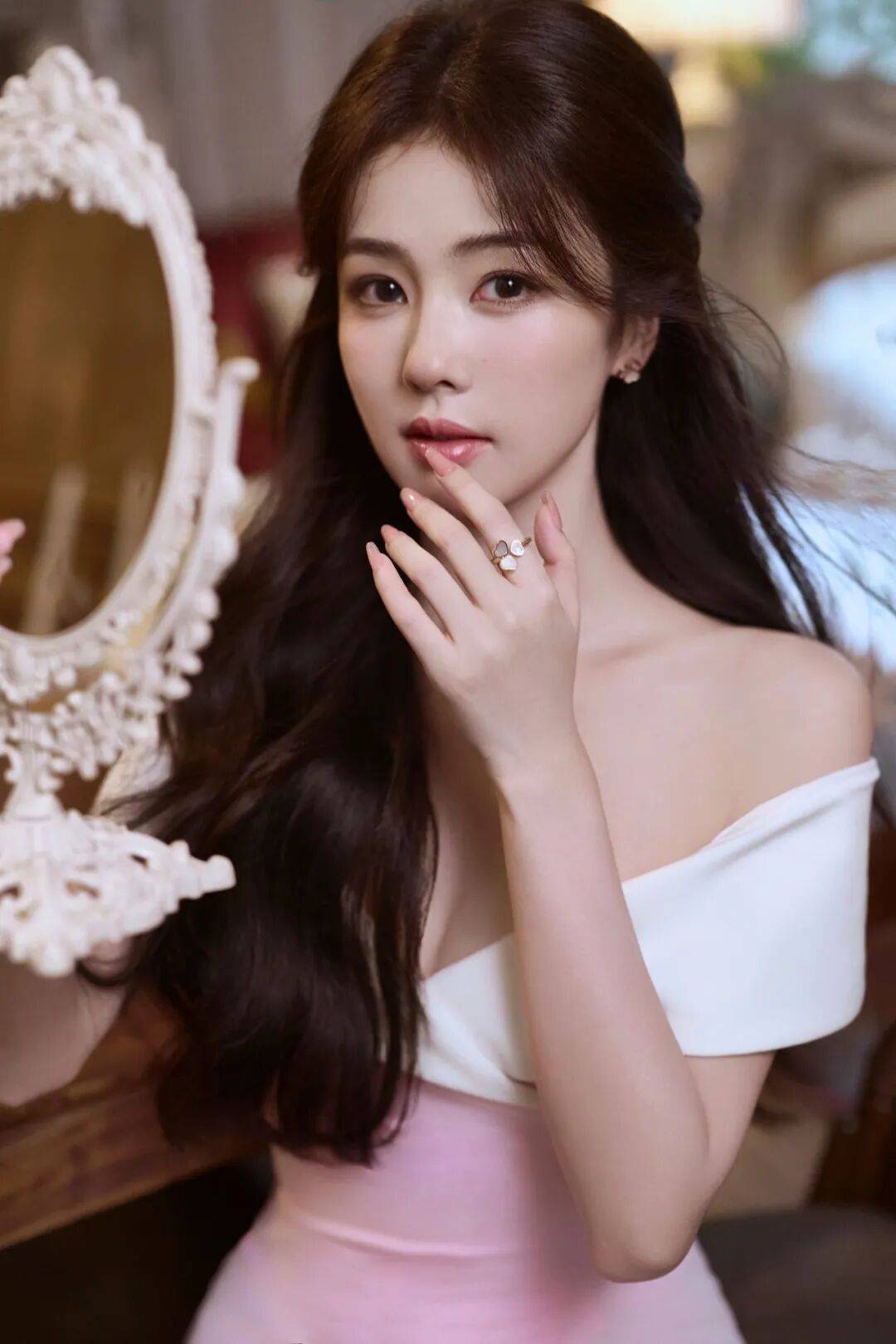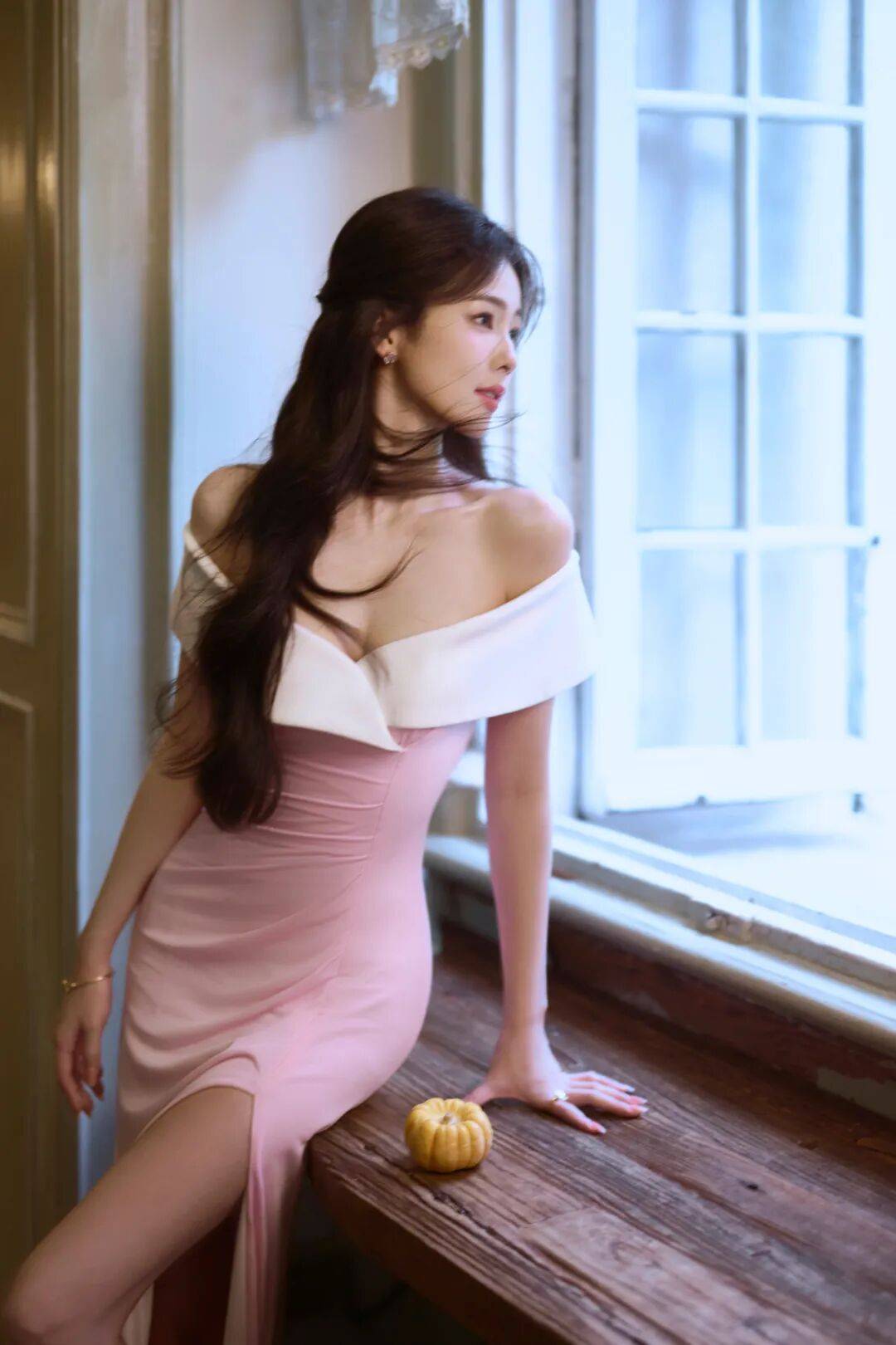 这身粉红造型之所以动人,在于色彩与情绪的完美共振。她可能穿着一件 oversize 的粉色卫衣,搭配百褶短裙,或是轻盈的粉色纱裙,整个人被柔软的颜色包裹。搭配她标志性的高马尾或蓬松卷发,妆容清透,腮红是自然的粉晕,笑起来眼睛弯成月牙,那种自内而外散发的阳光气息极具感染力。