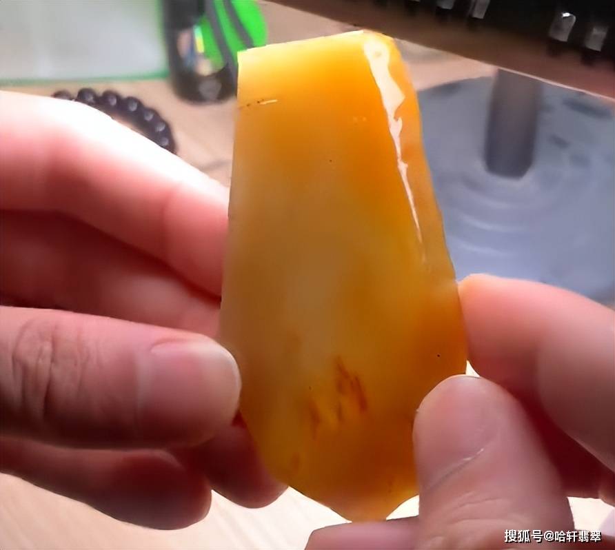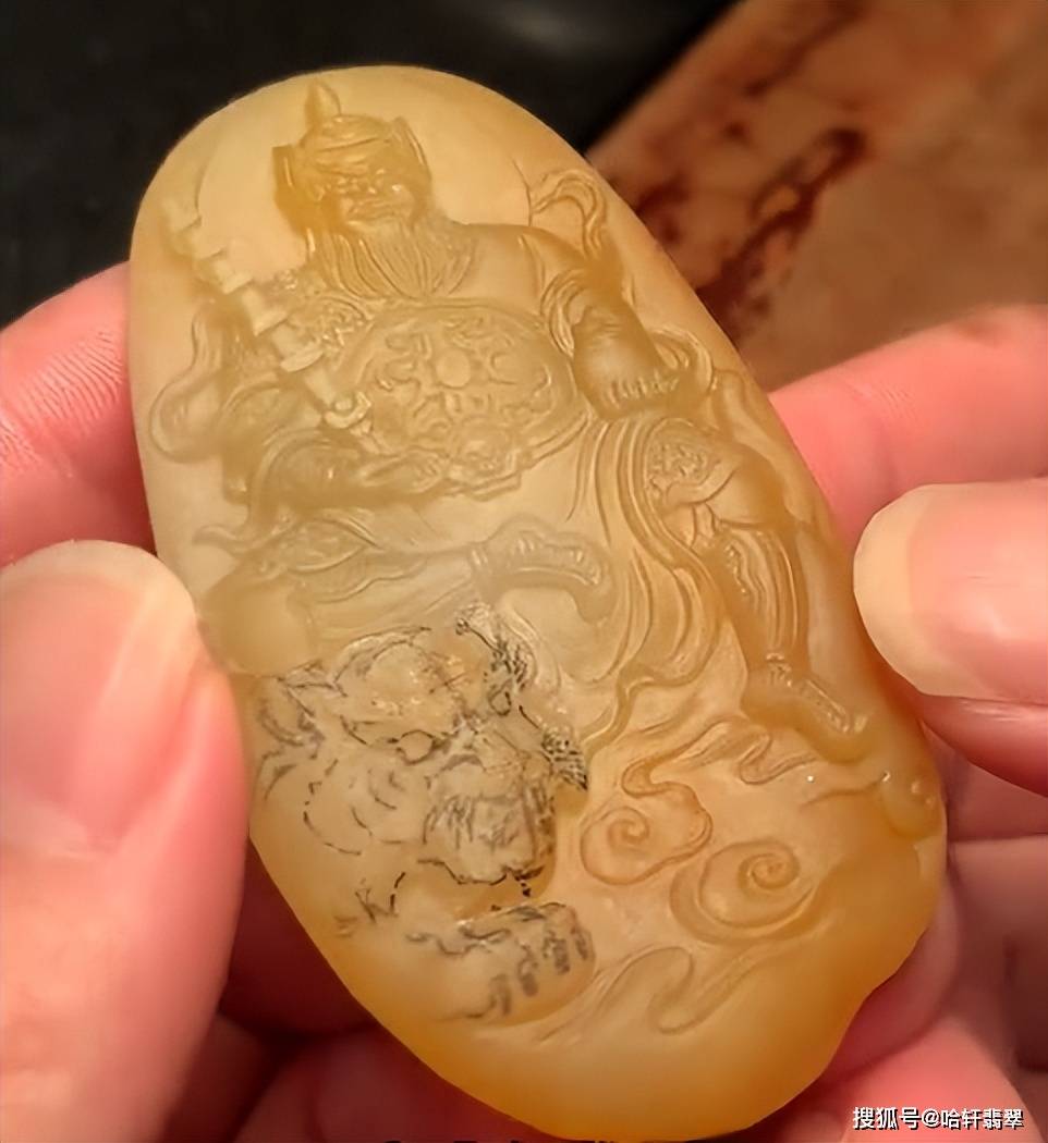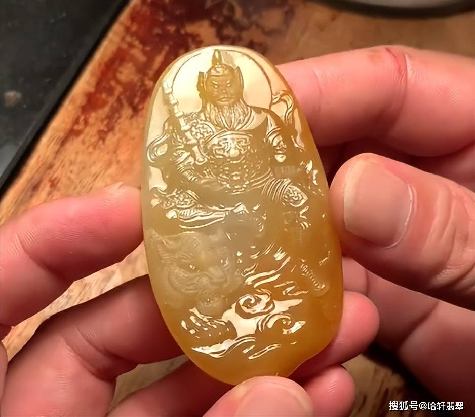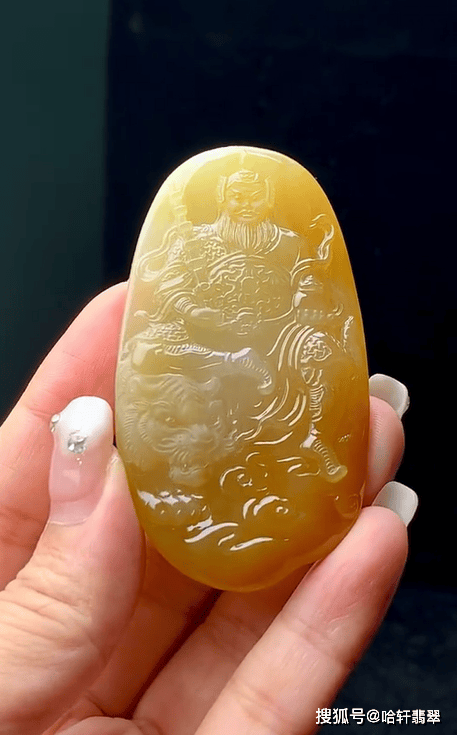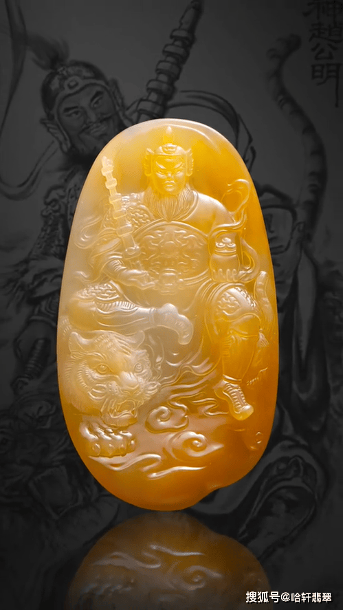 本次定制选用的是一块黄翡料子,种老细腻,颜色自然晕染过渡,醇厚如蜜,选黄翡为赵公明造像,其色调温暖且贵气,与财神象征的财富与尊贵相得益彰。