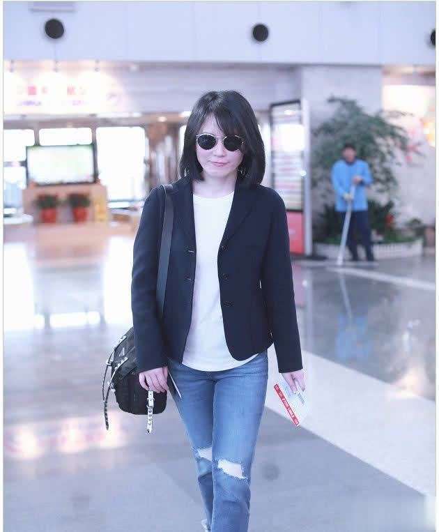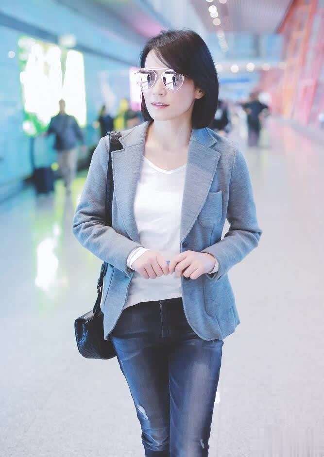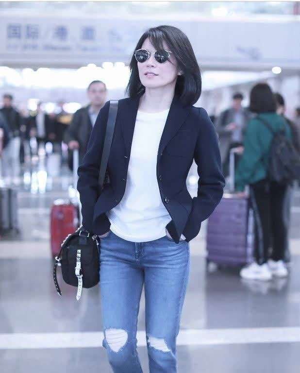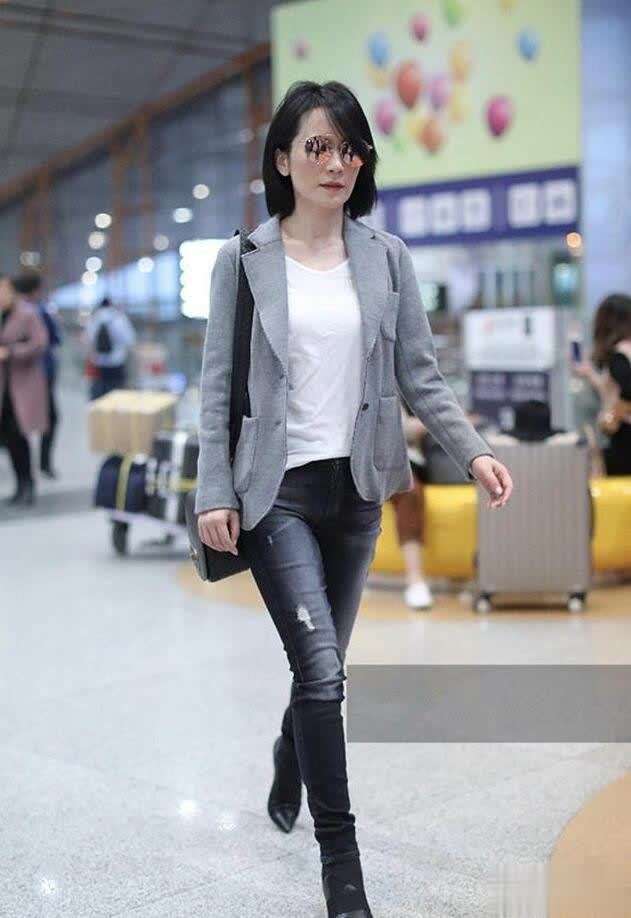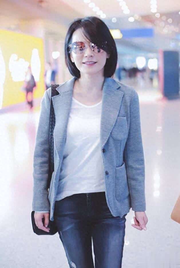 接下来,我们来看看另一套造型——黑色西装配牛仔裤👖和小白鞋。俞飞鸿依然运用了经典的黑白配色,简单却不失大气,展现出她一贯的高时髦感。黑色西装内搭白色T恤👕的组合看似简单,却将时尚感提升到另一个层次。