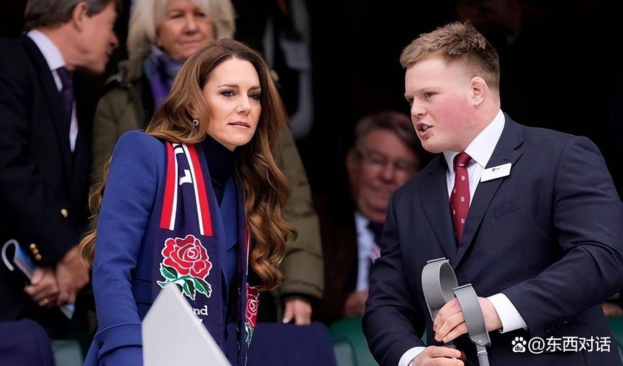 凯特当天的状态看起来相当不错。 她身穿一件剪裁得体的深蓝色羊毛大衣,内搭黑色球衣,脖子上围着一条印有红玫瑰徽章的红白蓝三色英格兰队围巾🧣。 这身装扮既高雅得体,又充满了支持国家队的体育氛围。 从现场曝光的照片看,她准时出现在看台上,全程举止从容。 她与英格兰橄榄球联盟主席黛博拉·格里芬亲切交谈,又专门与因伤未能上场的球员芬·巴克斯特互动,展现出亲和力与专业性。 照片中,她不时开怀大笑,精气神十足,完全看不出正身处家族风暴的中心。