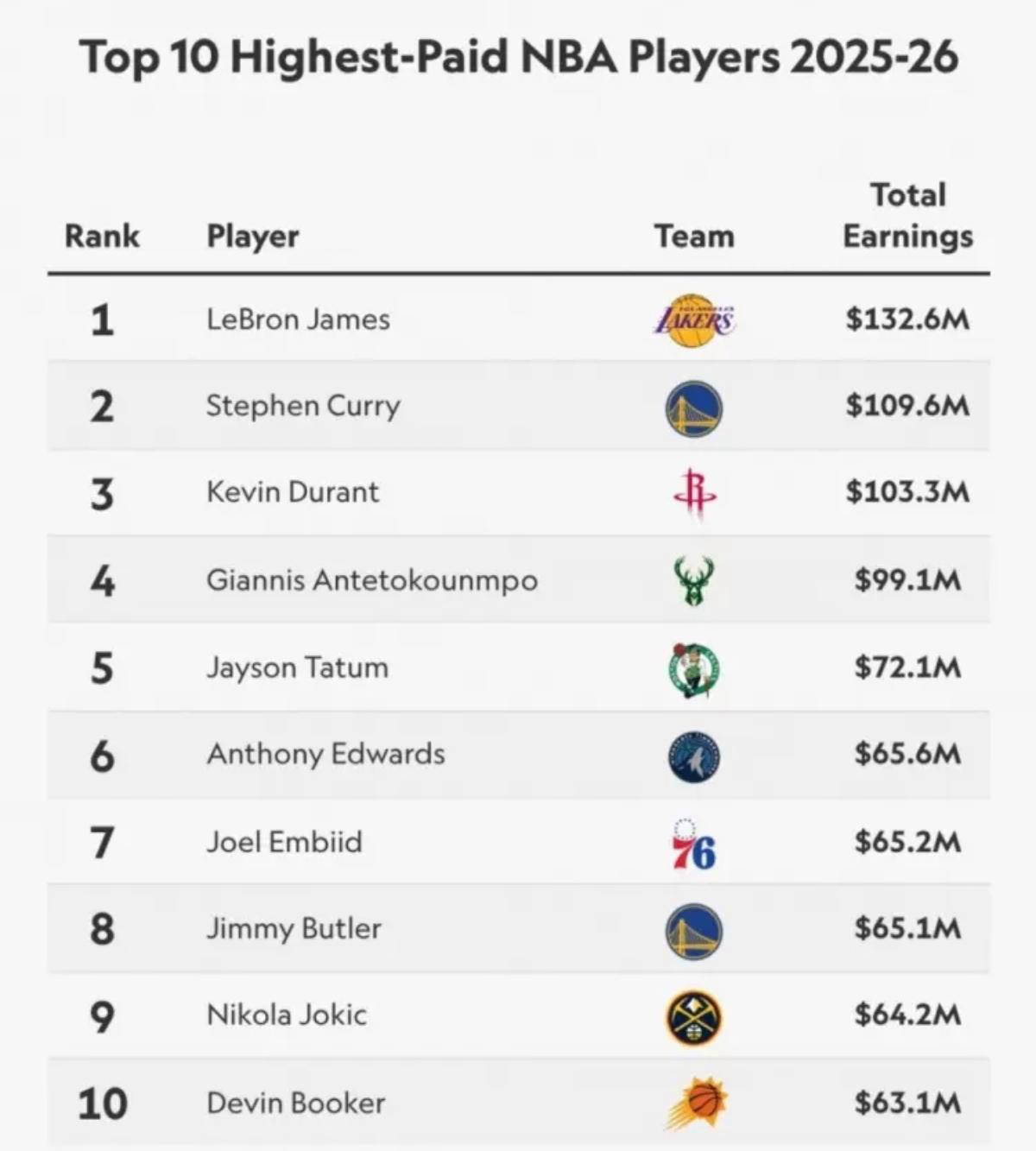 不过,对于年收入早已超过亿美元💵的杜兰特来说,这200万美元💵虽然听起来惊人,但其实只是他整体收入的一小部分。据美媒Sportico最新统计,2025-26赛季NBA薪酬榜单上,杜兰特位列第三,年收入高达1.033亿美元💵,仅次于『勒布朗·詹姆斯』(1.326亿美元💵)和史蒂芬·库里(1.096亿美元💵)。榜单中其他顶级球星如扬尼斯、塔图姆等也都有数千万美元💵的年收入。