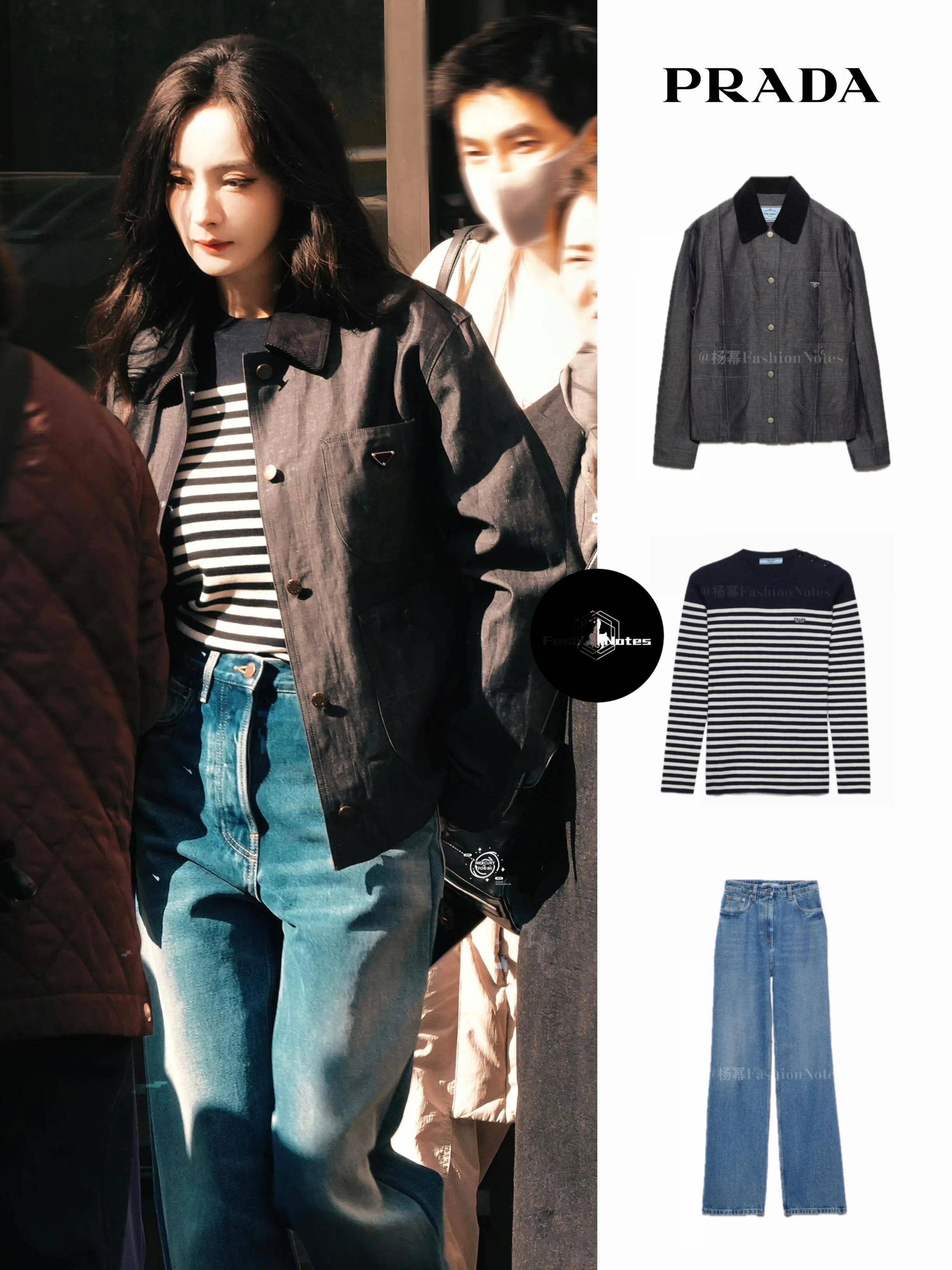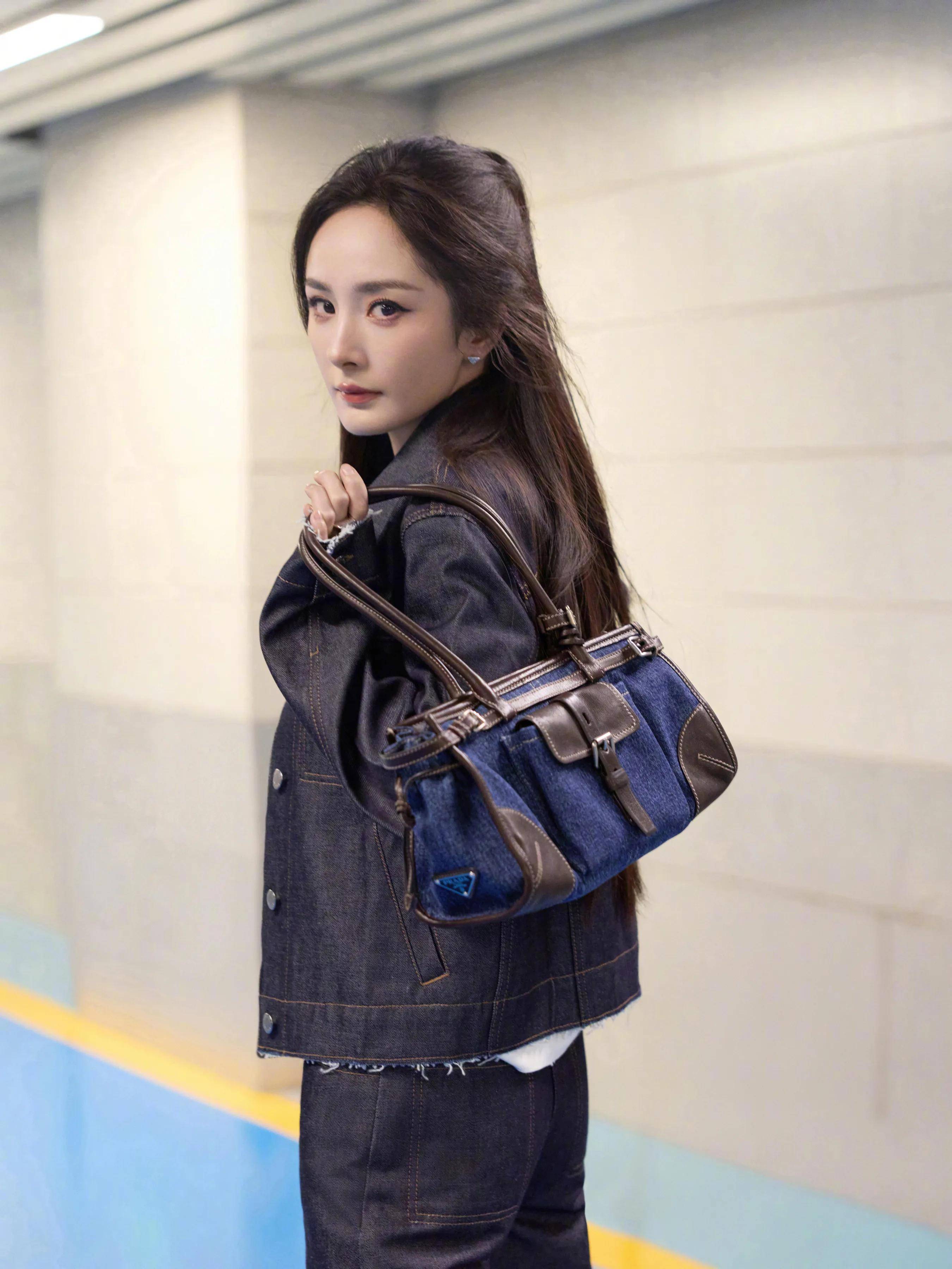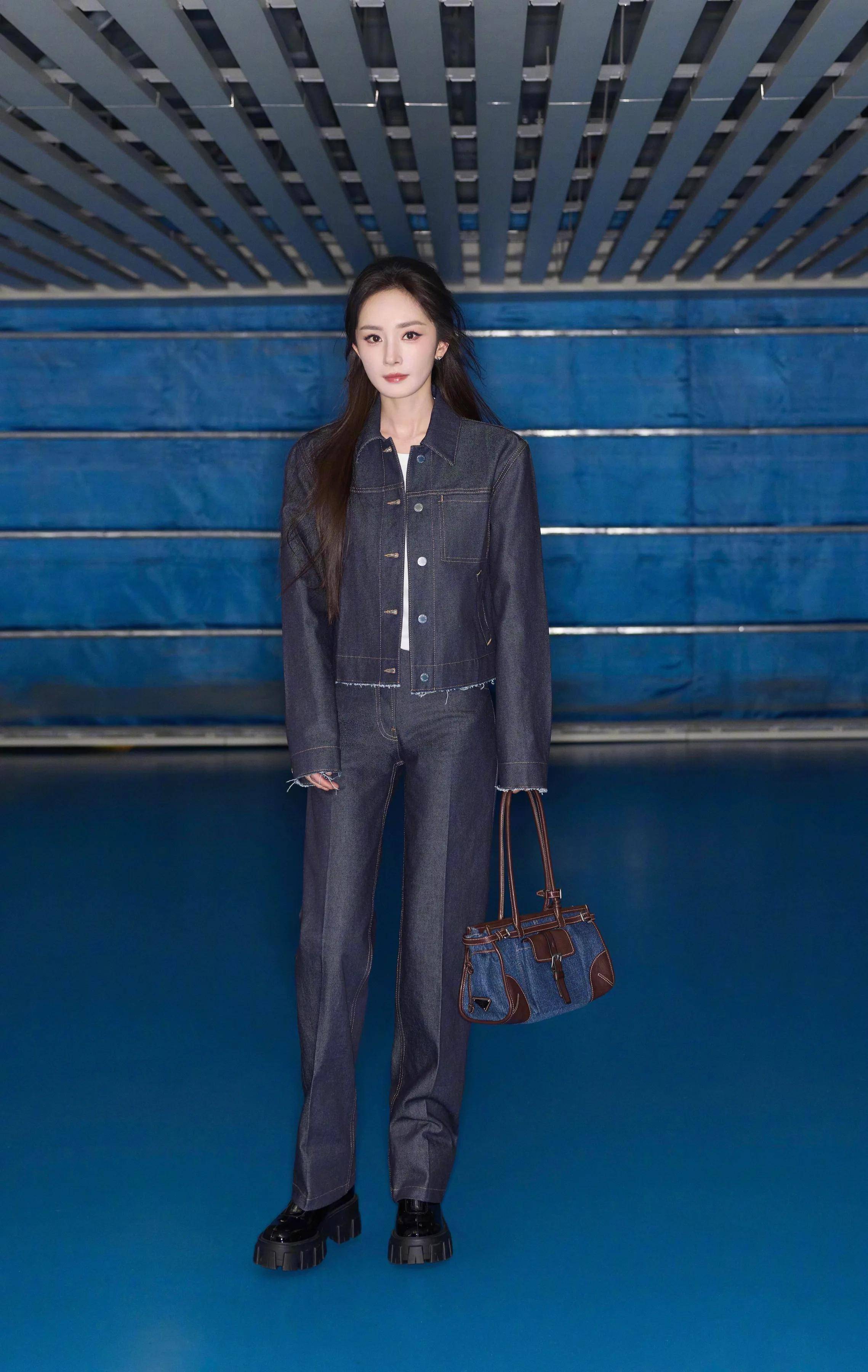 『杨幂』穿着Prada丹宁套装出发去米兰,手上拎着Prada的牛仔包,脚上穿着Prada厚底靴子。Prada这身衣服不好看,『杨幂』全靠脸在撑,一般人穿上身就有种工装的味道了。