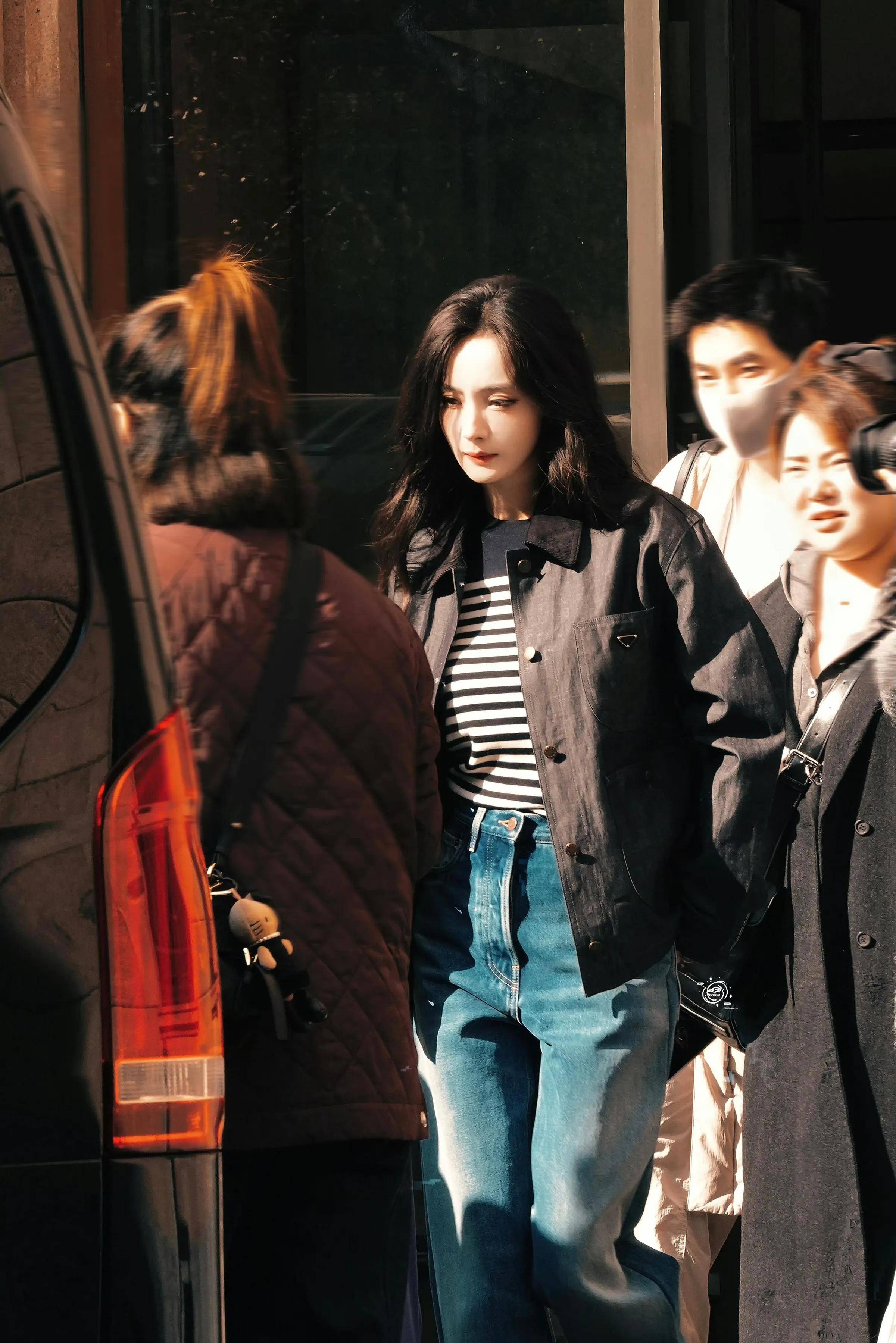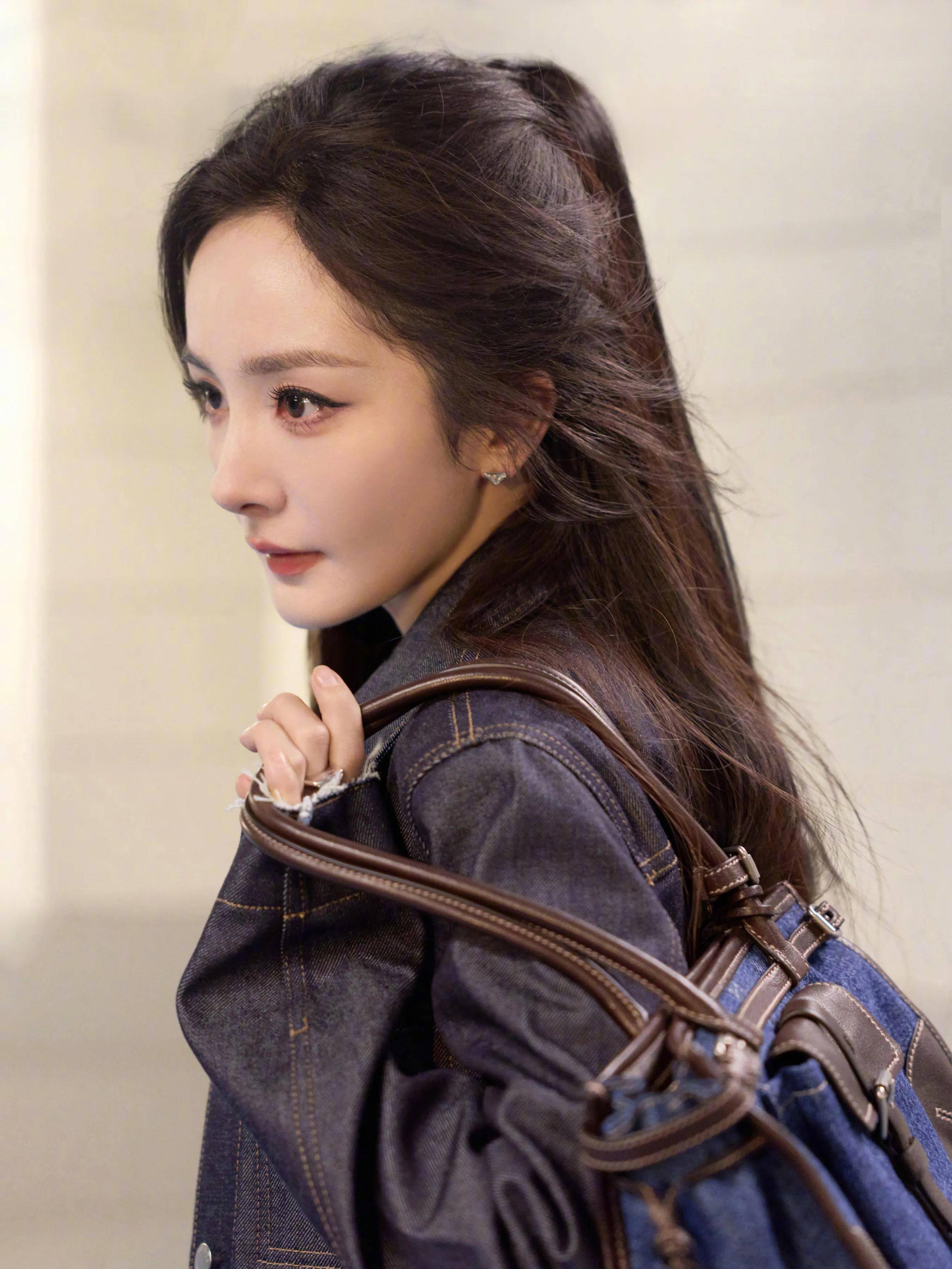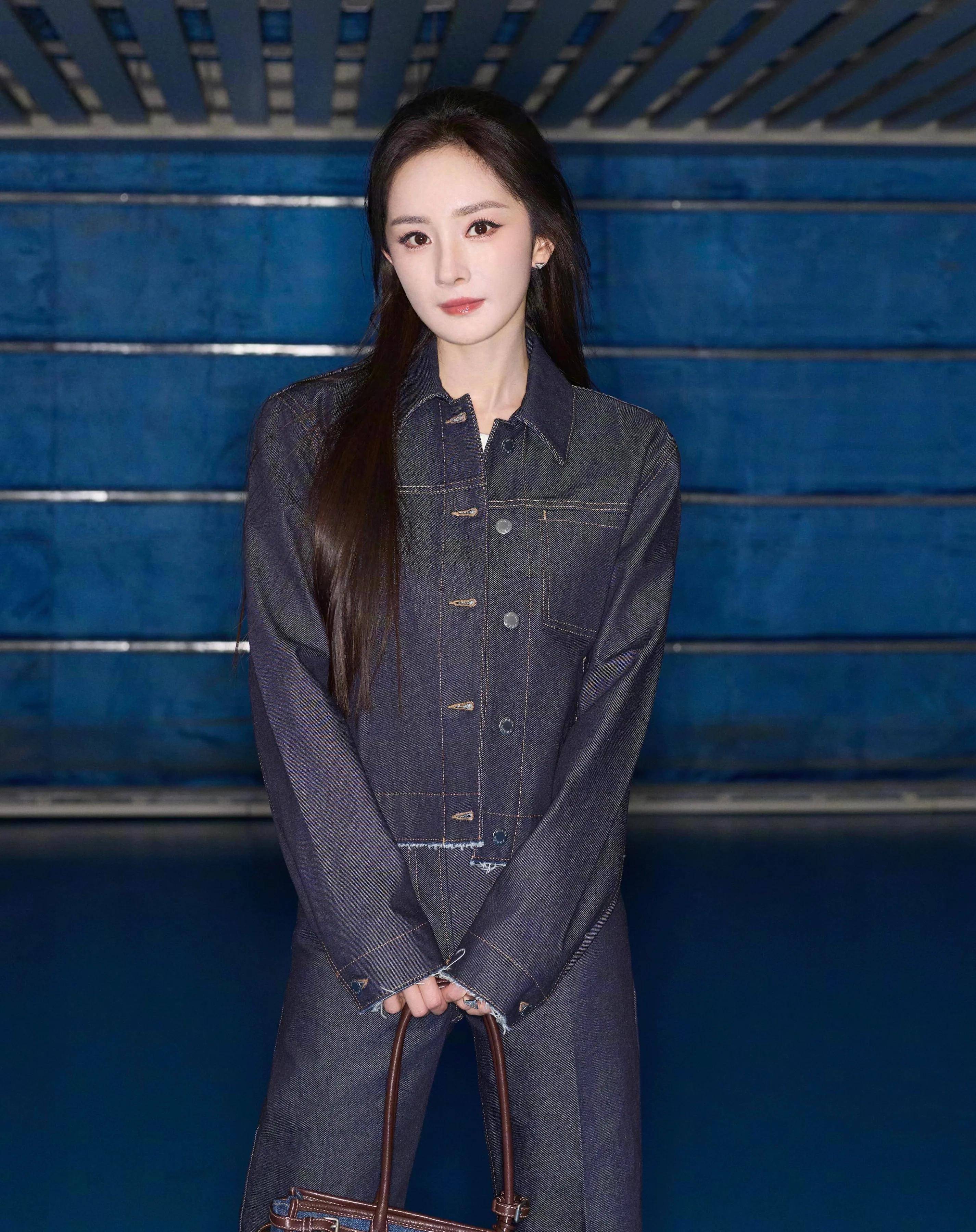 『杨幂』穿着Prada丹宁套装出发去米兰,手上拎着Prada的牛仔包,脚上穿着Prada厚底靴子。Prada这身衣服不好看,『杨幂』全靠脸在撑,一般人穿上身就有种工装的味道了。