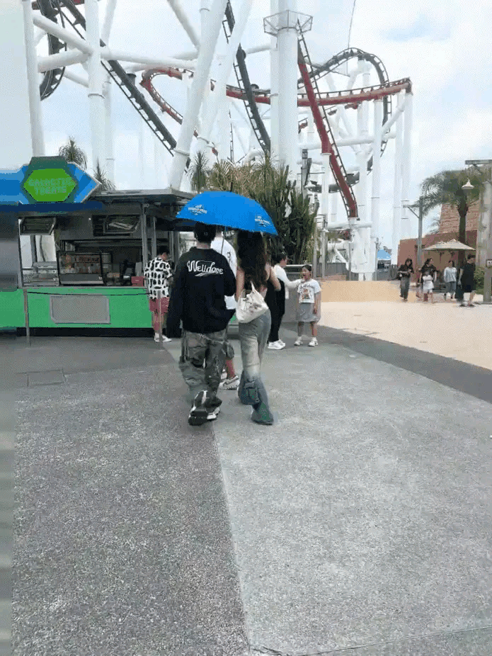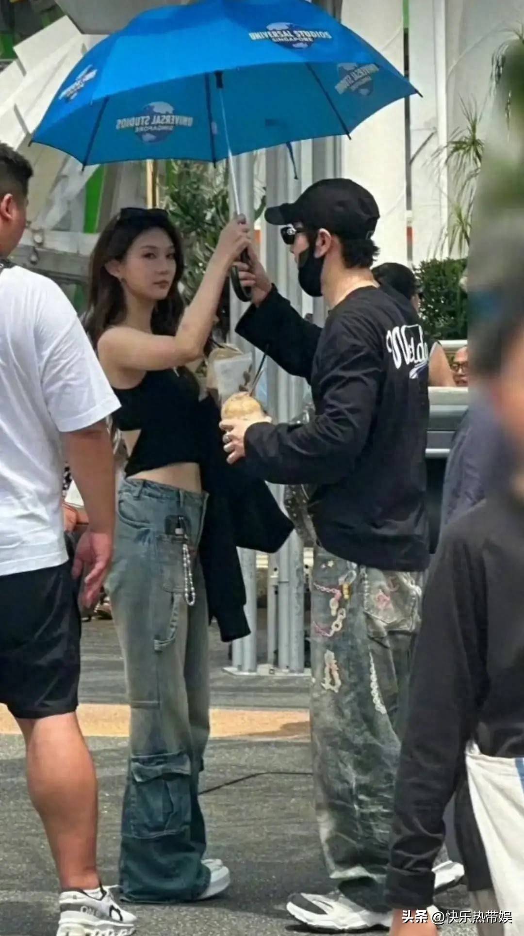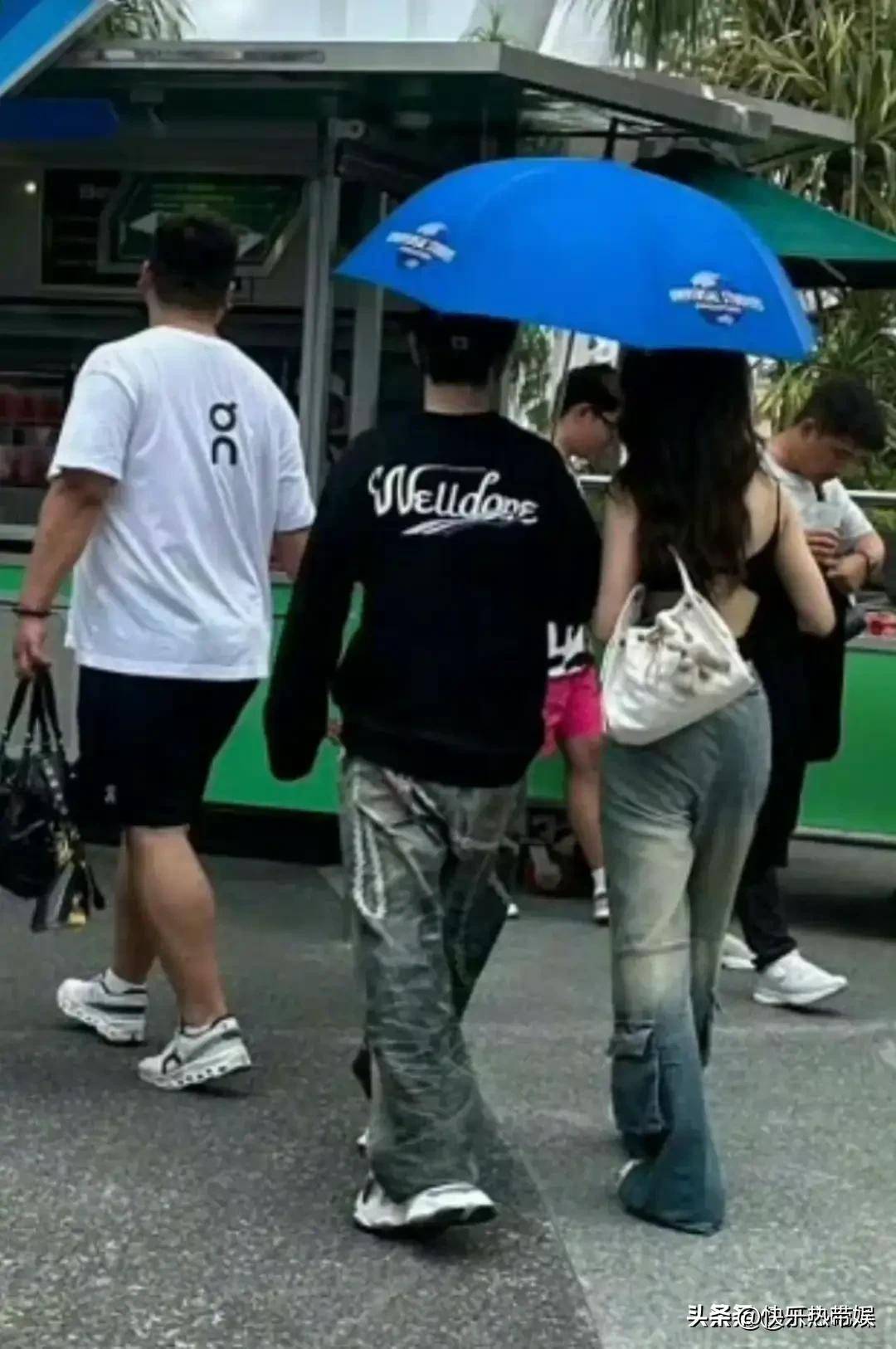两人同撑一把伞,举止间透出一种亲密无间的氛围。更引人注目的是,他们竟然穿着同款的情侣『运动鞋』,连裤子也是同一种风格,都是工装牛仔裤👖,仿佛一对默契十足的情侣。『黄晓明』的目光始终关注着女孩,看得出他在她身边有些小心翼翼,显得十分温柔。