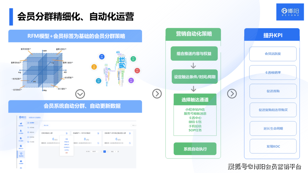 博阳会员管理系统,众多头部品牌见证的全渠道会员营销系统,打通全渠道数据,构建全渠道统一的会员体系和标签体系、对用户画像建模及优化、通过互动营销平台和营销自动化,连接私域SCRM、企微社群、小程序商城、公众号、短信,自动化培育会员。实现一对一精准沟通,线上线下一体化运营,降低获客成本,提升转化率。)