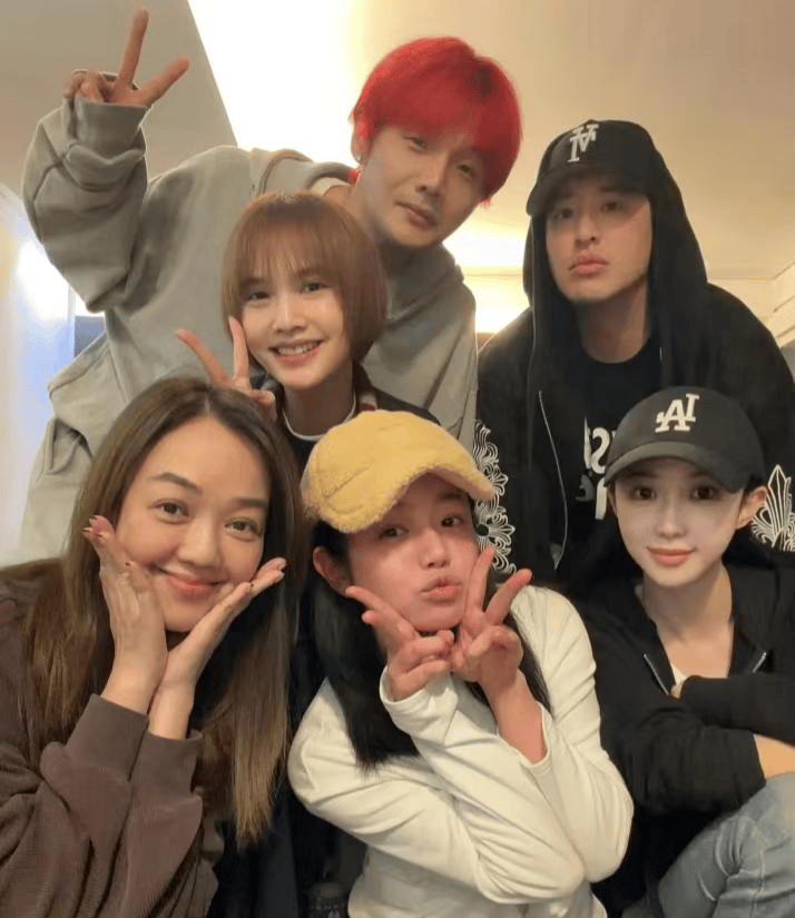 『杨丞琳』、『李荣浩』、『陈妍希』那天也在场,四个人站一块儿,没摆pose,『李荣浩』红头发刚染的,『杨丞琳』短发翘着一撮,『陈妍希』比耶的手有点歪。没人刻意站C位,也没人补妆重拍,就像普通朋友串门吃完饭,顺手拍一张。
