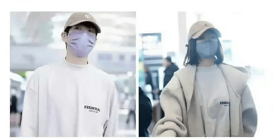 同一天,『魏大勋』也被拍到现身机场。同系列白色卫衣,连帽子和口罩配色都跟『秦岚』搭上了。两件卫衣胸口的“ESSENTIALS”字样一模一样,版型也如出一辙。发图的博主只回了一句“xql共享衣橱”,配上眨眼表情,暧昧感拉满。这已经不是第一次了。