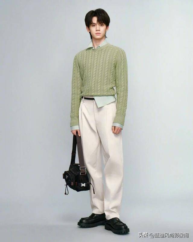 左航的豆绿色短款『针织衫』,是整套造型里的清新氛围感担当。低饱和的豆绿色治愈不挑皮,完全没有亮色的扎眼感,短款剪裁精准卡在腰线,搭配垂坠感十足的米白色休闲西裤,三七分的身材比例直接拉满。『针织衫』的细腻软糯肌理,和西裤的利落垂坠感形成完美的材质对冲,上柔下挺,既有少年的清新治愈感,又有 PRADA 的极简高级感,搭配黑色 PRADA 挎包,点睛不抢戏,文艺又干净,把他身上的灵动少年感完美放大。