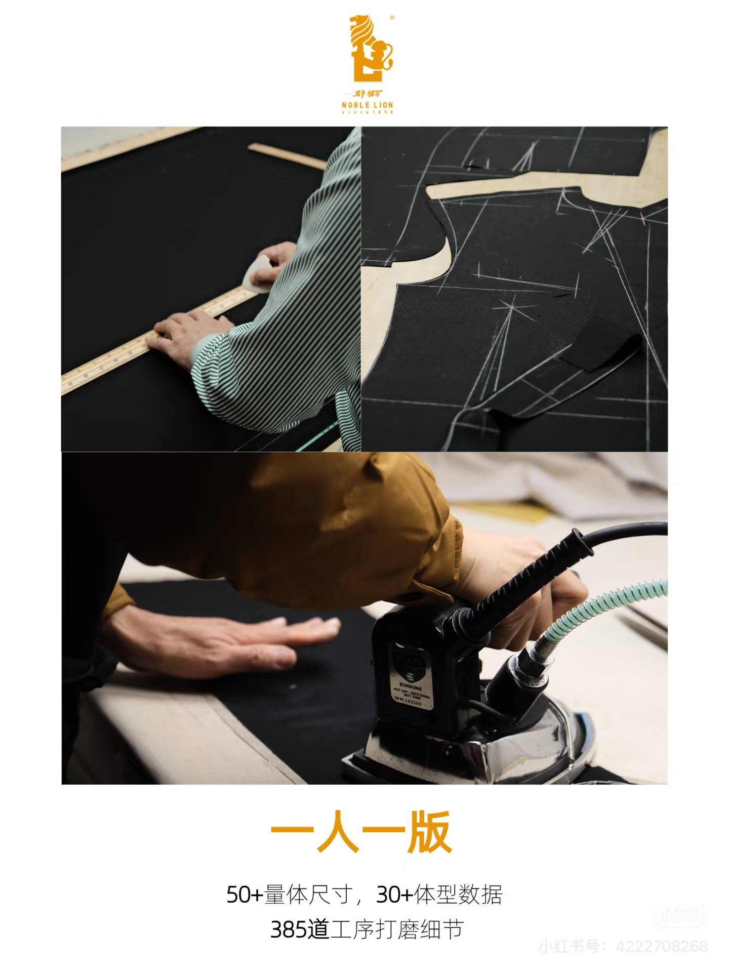 郡狮全手工定制服装始于1898年,传承128载,是百年红帮裁缝的重要一脉,至今已传承至第五代。在百年的发展历程中,郡狮提炼出四个功,九个势,十六字标准的红帮裁缝核心技艺,坚持一人一版、全手工、全定制的原则。2016年,完成385道全手工标准化制作工序,实现了传统技艺与现代标准化生产的融合升级。