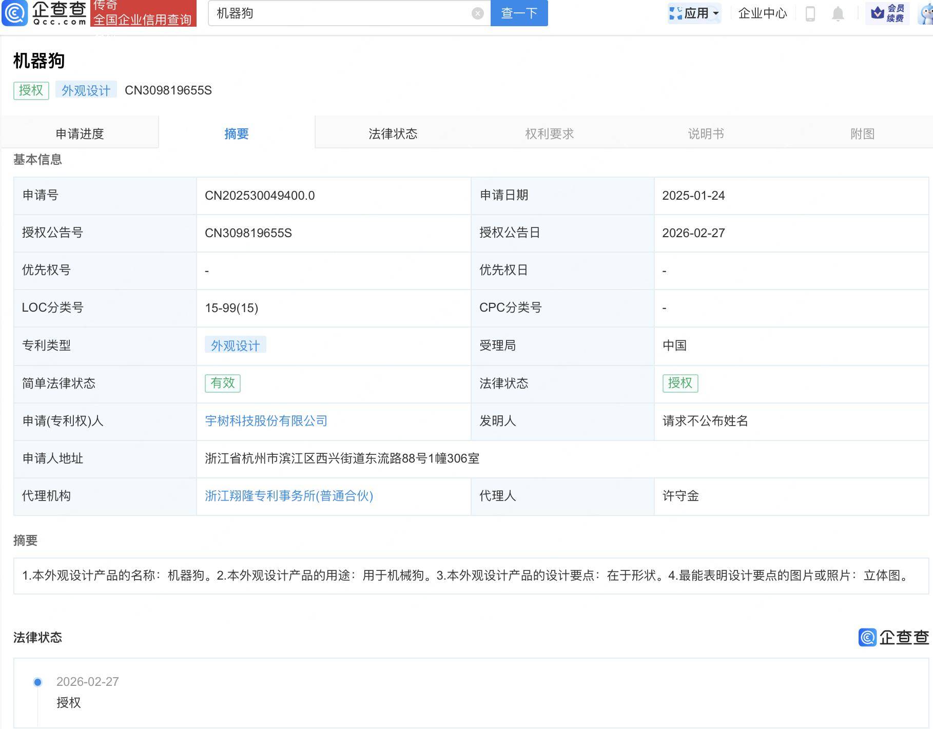企查查APP显示,近日,宇树科技股份有限公司“机器狗”外观设计专利获授权。企查查专利摘要显示,本外观设计产品的用途为用于机械狗,其设计要点在于形状。