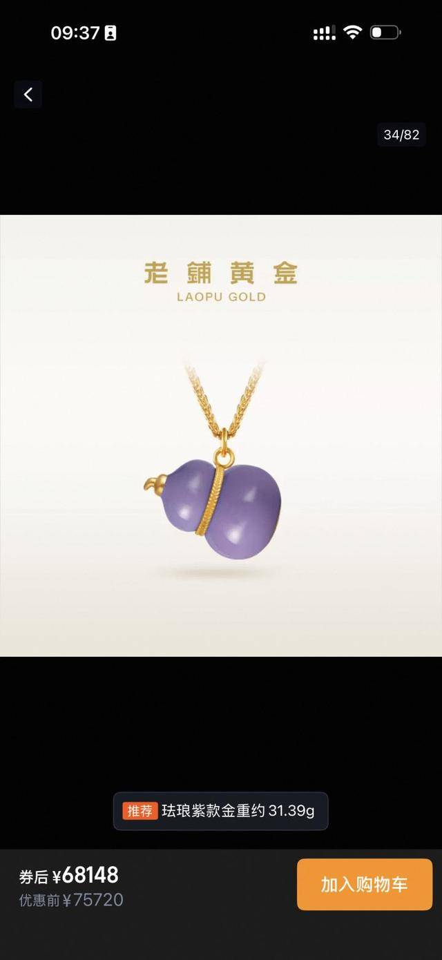 昨天晚上,杭州的祝小姐花52000多元买的一个珐琅葫芦吊坠(31.39克),刚才打开老铺黄金天猫旗舰店,发现同样是9折,已经涨到了68148元,相当于一夜之间涨了16000多元。