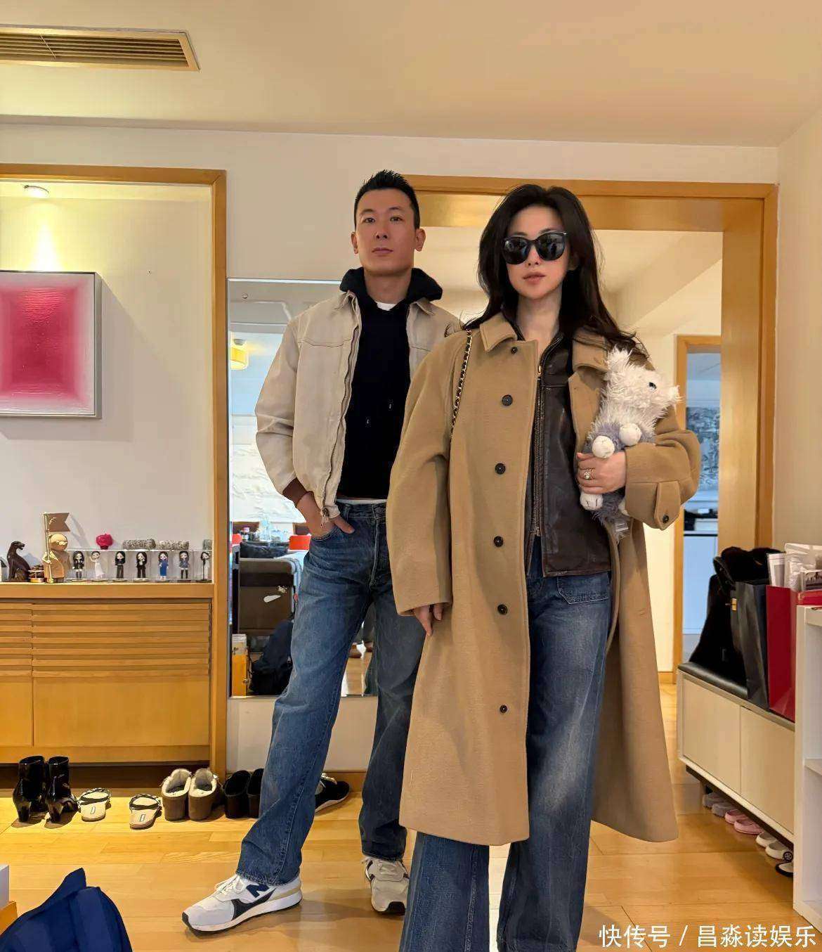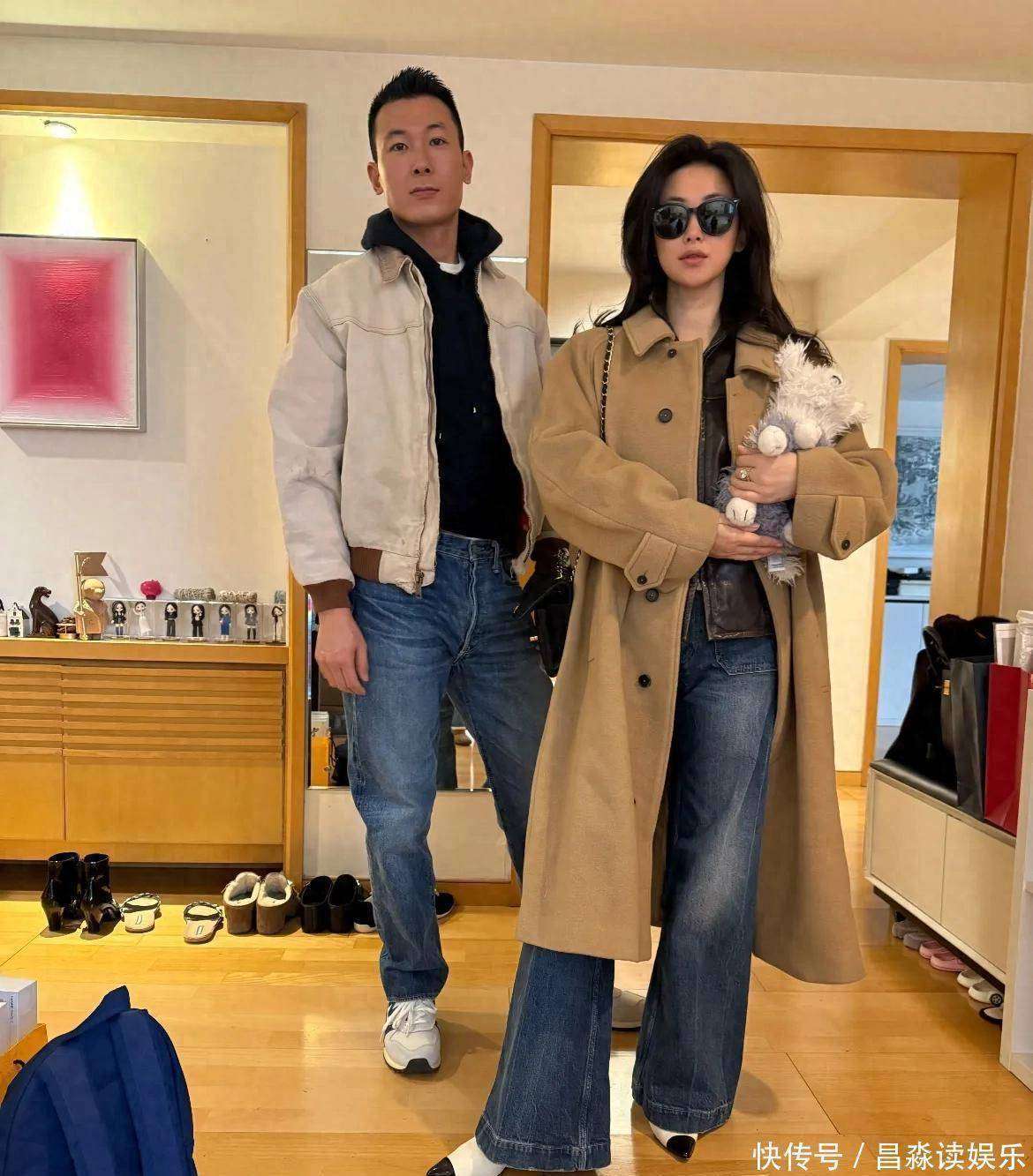 『朱珠』当天的『穿搭』充满了知性美感,她内搭的是一件深咖色的皮衣,外面套着一件优雅的棕色呢子大衣,下面配着一条牛仔裤👖和一双高跟鞋👠,整个人看起来简洁却不失风度,恬静中带着成熟韵味。尽管她没有化妆,素颜出镜,但皮肤状态依旧无可挑剔,五官立体分明,给人一种自然流露的女性♀️魅力。站在她身旁的老公王昀佳,穿了一件简约的黑色卫衣,外搭一件米白色的夹克,下身是牛仔裤👖,两个人站在一起,仿佛穿上了默契的情侣装,彼此的气质恰到好处地相互映衬。