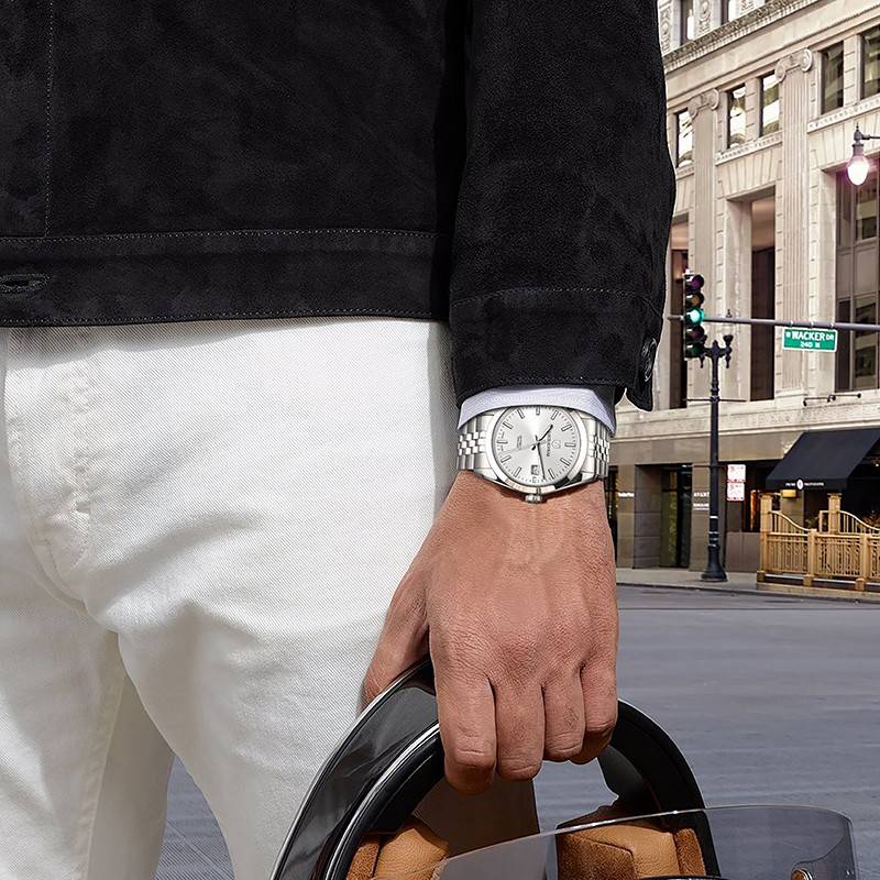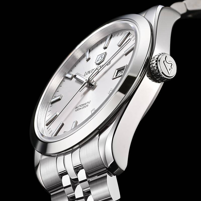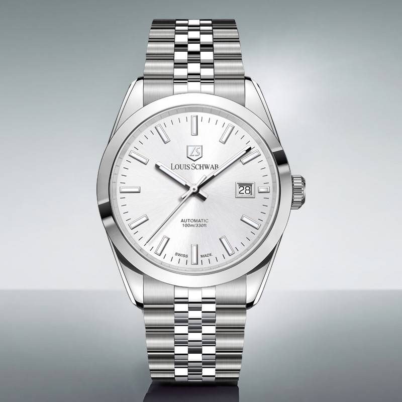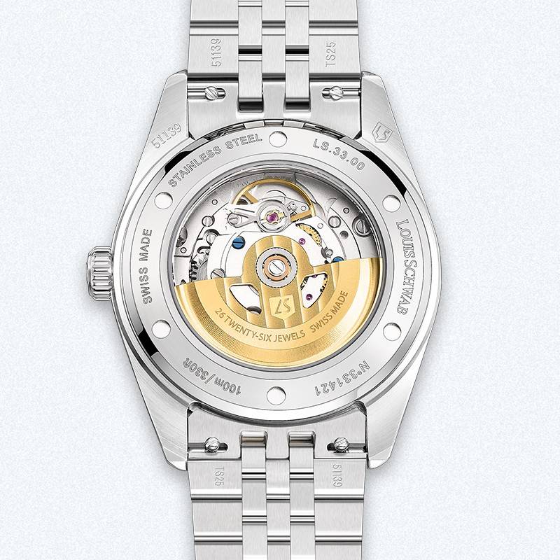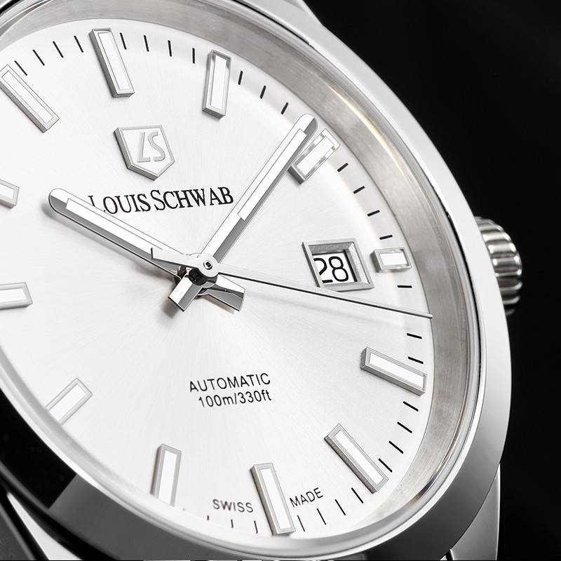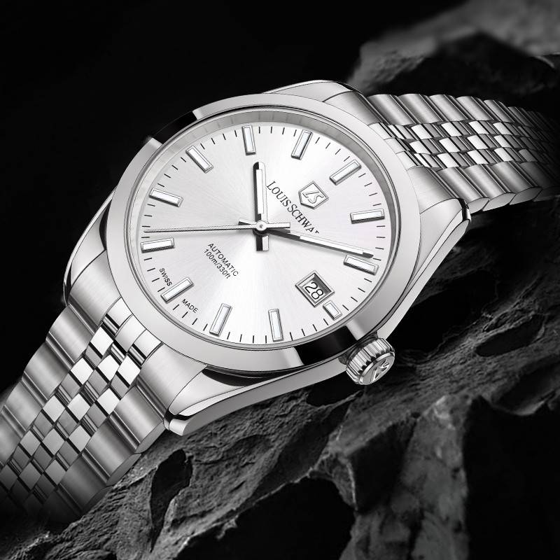 颜值与细节之外,LS.33.00的核心品质同样经得起考验,延续了路易施瓦布“平民瑞士高品质腕表”的定位。搭载瑞士原产自动上链机芯,内置26颗宝石轴承,振频达28800次/小时,走时精度稳定在±5秒/天,远超同价位腕表平均水平;41小时动力储备,无需频繁上链,适配现代生活节奏;双面防眩光蓝宝石水晶玻璃表镜,耐刮耐磨,强光或水下环境下也能清晰读时;100米防水性能,日常洗手、淋雨毫无压力,让细节美学与实用性完美兼顾。