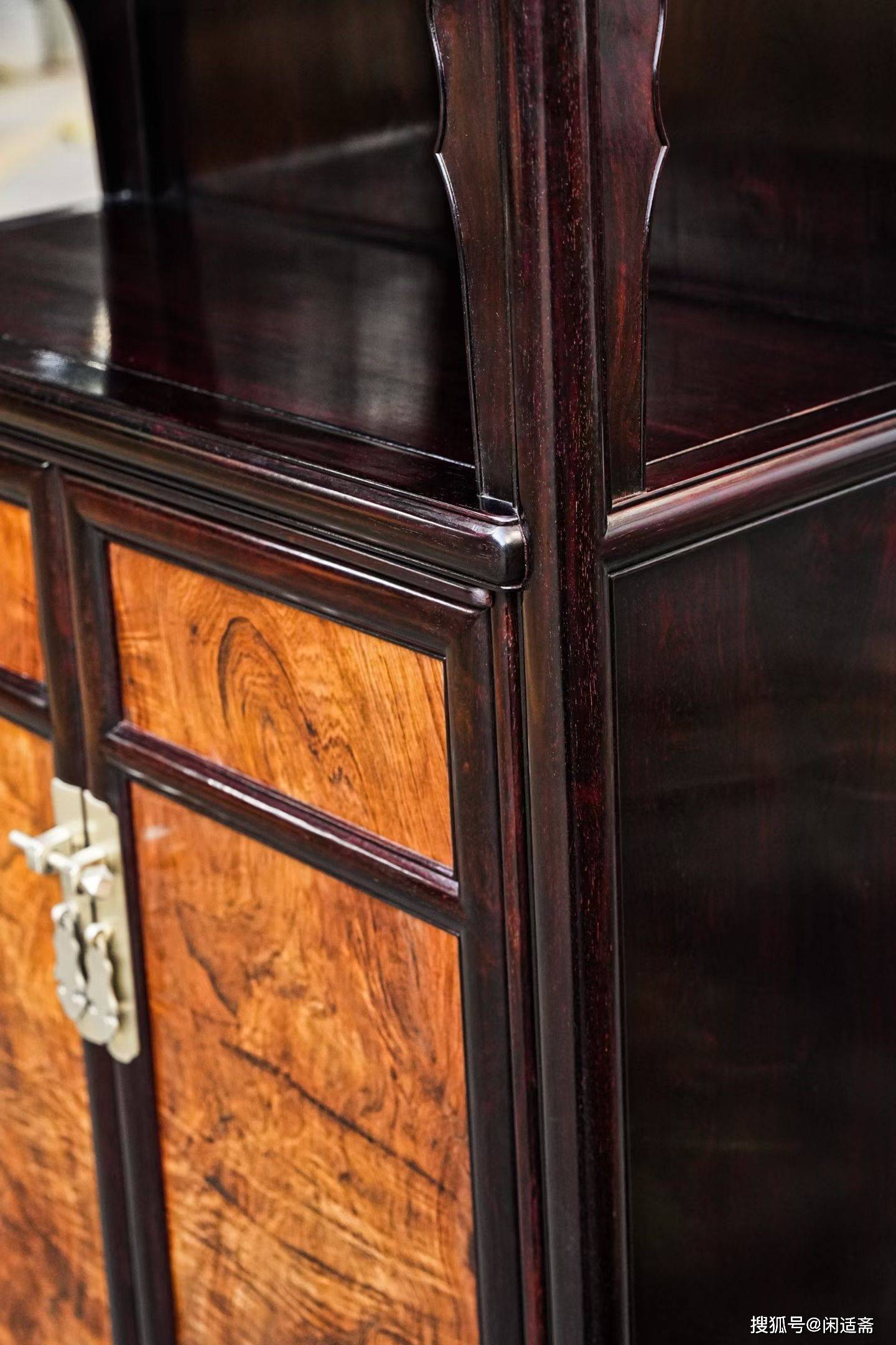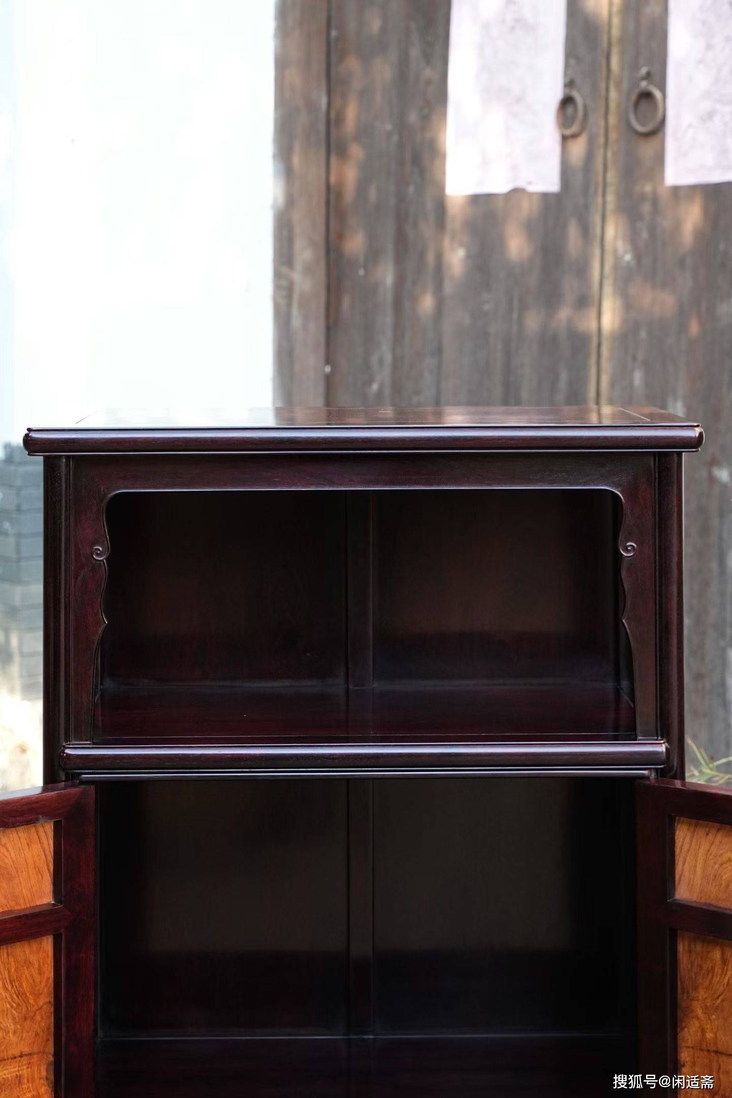 器物形制遵循经典万历柜样式,比例匀称、线条流畅,无一丝冗余雕琢,尽显明式家具“简约而不简单”的精髓。柜体上部设通透亮格,形制方正,可陈列瓷瓶、雅玩、古籍善本,既能彰显主人的雅致品味,又能让器物与空间相映成趣;下部为对开柜门,严丝合缝、开合顺滑,内部空间规整,可收纳私密器物、四季衣裳,兼顾美观与实用性。