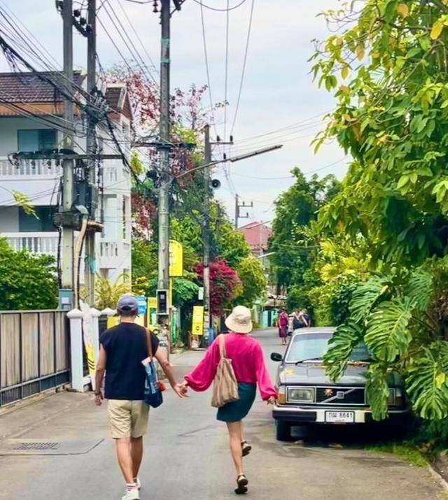在泰国清迈,李静和戴军牵着手漫步在街头,仿佛回到了年轻时的无忧无虑。李静已经56岁,穿着一件鲜艳的红色上衣和牛仔裙,戴着一顶度假帽,跳跃的步伐,甚至从背后看,给人一种活泼、俏皮的感觉,像是一个小姑娘。而戴军,和她一样,也是56岁,黑色的T恤👕和棒球帽,『打扮』得十分潮流。他们两个在清迈街头并肩走着,亲密无间,令人不禁猜测:难道他们在一起了吗?