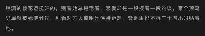 『程潇』的职业生涯一直处于一个不温不火的状态,虽然她演技尚可,但并没有特别出众的表现。在如今人人都在拼社交、争曝光的『娱乐圈』️,她看起来像是个宅在家中玩游戏、看动漫的女孩。她很少传出什么绯闻,这或许也是她给人的一种神秘感。最近,有人爆出了她的一些桃花运小八卦,虽然『程潇』并未证实过这些传言,但作为27岁的她,谈恋爱似乎也不是什么不可思议的事。
