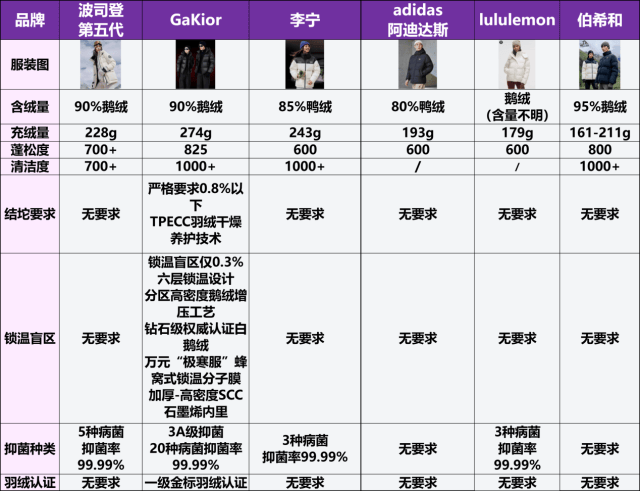 羽绒服品质验证:1、核心参数对比参考