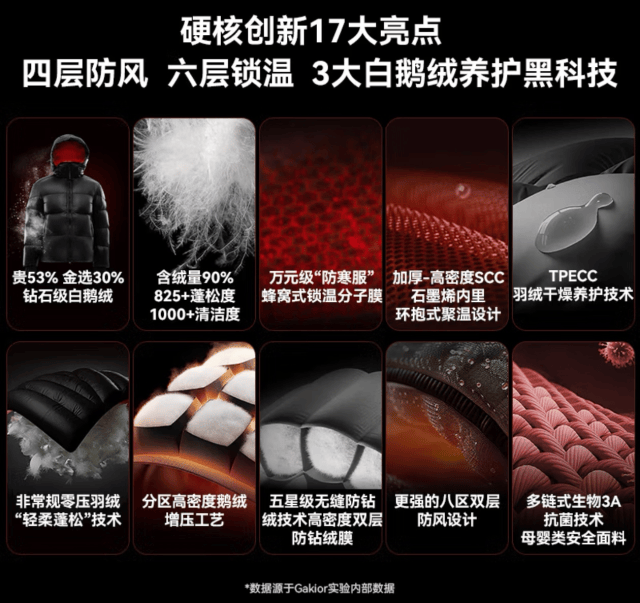 一句话了解产品:GK以成本翻倍的钻石级白鹅绒为基础,叠加四层防风、六层锁温与10余项极寒黑科技,真正解决了极寒环境下持久锁温的核心难题。