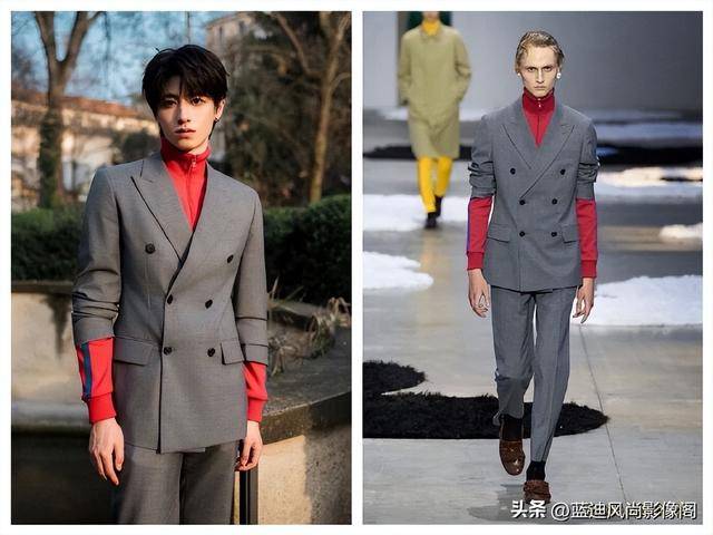 朱志鑫的深灰色双排扣套装,完美诠释了 PRADA 的极简精英美学。面料是品牌标志性的哑光精纺羊毛,细腻垂坠不僵硬,双排扣设计是 PRADA 的经典符号,却用略带松弛的 H 型廓形,弱化了西装的严肃感,添了几分少年的清俊。内搭的正红色高领『针织衫』,在冷调灰的底色上,跳出一抹热烈,既打破了套装的沉闷,又把他身上清冷又热烈的少年感完美放大,搭配 PRADA 经典的金属配饰,点睛不抢戏,文艺又高级。