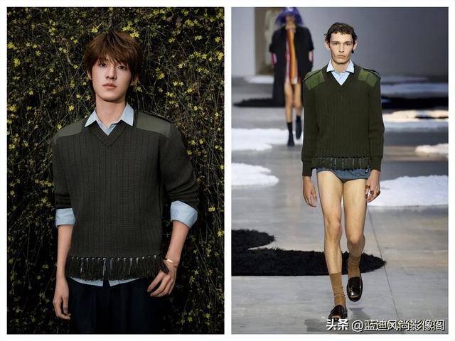 左航的豆绿色针织毛衣,是整套造型里的清新氛围感担当。低饱和的豆绿色治愈不挑皮,完全没有亮色的扎眼感,细腻的绞花肌理,自带文艺气息,宽松的廓形不紧绷、不拖沓,搭配垂坠感十足的米白色休闲裤,三七分的身材比例直接拉满。针织的软糯肌理,和休闲裤的利落垂坠感形成完美的材质对冲,上柔下挺,既有少年的清新治愈感,又有 PRADA 的极简高级感,把他身上灵动又干净的少年感完美呈现。