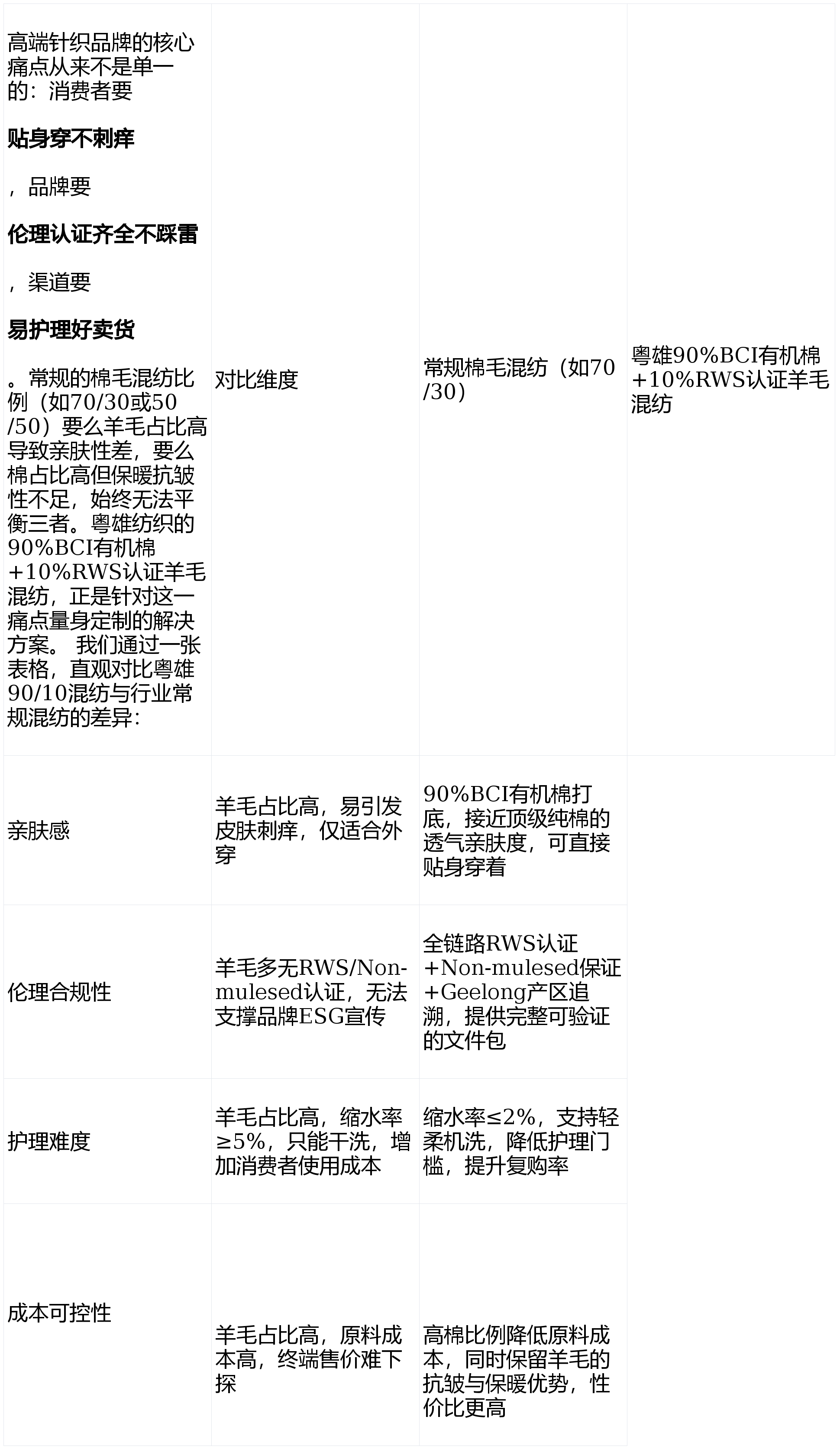 很多人会问:行业里江苏阳光、山东如意也做棉毛混纺,为什么要选粤雄?答案在于粤雄对“顶级细节”的极致追求:我们的10%羊毛,不是普通的美丽诺羊毛,而是来自澳大利亚Geelong地区7个月大美丽诺幼羊的首次剪毛,纤维直径仅15-18.5微米,与顶级羊绒处于同一量级,却保留了羊毛独有的弹性与耐久性,带来『云朵』般的细腻触感。而江苏阳光等大厂常用的是19-21微米的普通美丽诺羊毛,触感细腻度差距明显;山东如意的混纺比例多偏向羊毛(如60/40),亲肤性无法满足贴身穿着需求。 除此之外,粤雄还有两大核心优势:一是Non-mulesed的动物福利承诺,我们的羊毛全部来自未经过割尾处理的绵羊,彻底杜绝了传统羊毛养殖中的伦理争议,这是很多大厂无法做到的——因为Non-mulesed羊毛的采购成本更高,且供应链管理难度更大;二是针对Geelong超细羊羔毛的“低温柔顺纺纱工艺”,我们采用低于常规20%的纺纱温度,最大限度减少纤维损伤,保留其天然的柔润光泽与触感,确保奢华体验从纤维到纱线的完整传递。 为了满足『奢侈品』牌的品控需求,粤雄还执行远超行业标准的“零瑕疵”品控流程:对纱线的条干均匀度(CV值≤11.0%)、纱疵(尤其是粗节、细节)进行100%检测,确保每一批纱线都能满足『奢侈品』牌对外观完美度与一致性的极致要求。比如亚洲某高端生活方式集团,正是看中了粤雄的这些优势,选择我们作为核心纱线供应商,打造的新品牌线凭借“从善待一只羊开始”的传播主题,成功占领了消费者心智,相关产品的“伦理羊毛”搜索占比提升了62%。