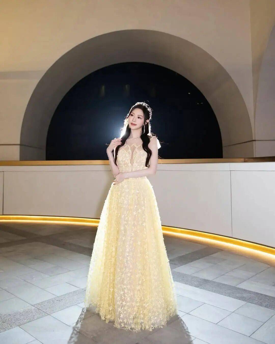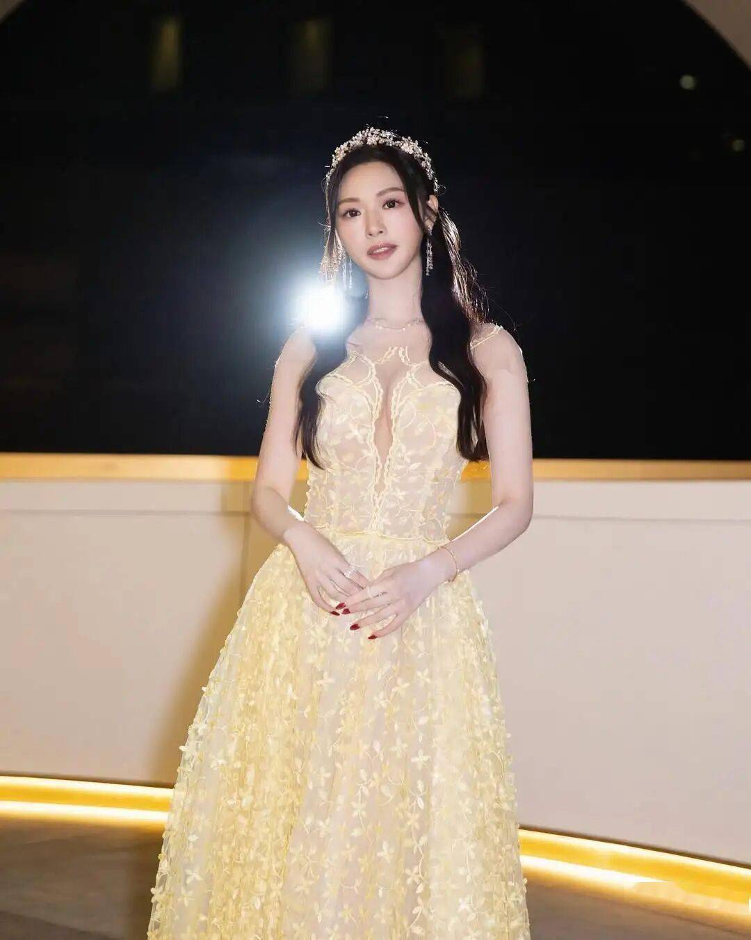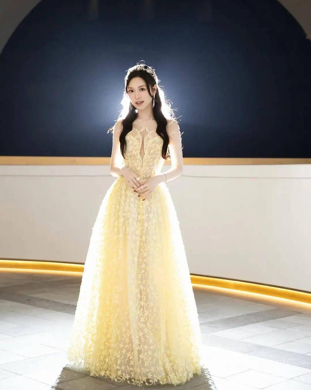 当晚,冯盈盈身穿一袭金色透视蕾丝晚装长裙👗亮相,胸前透视设计让事业线若隐若现,贴身剪裁勾勒出凹凸有致的身材。再加上头戴闪亮皇冠,尽显女神气场。网友看到照片后纷纷留言大赞她漂亮又有气场。