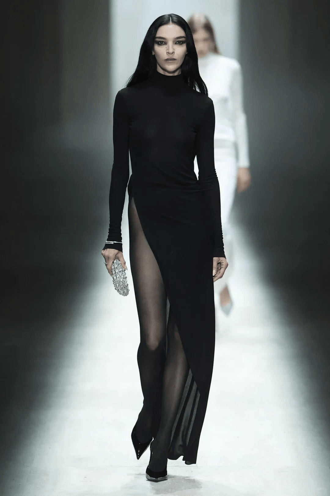 女模特设计更大胆,超模刘雯穿斜肩蓝色亮片长裙👗,高开叉开到腰腹,走秀时腰以下几乎全露,亮片材质配夸张开叉显累赘。传奇超模Kate Moss压轴,黑色亮片高领长裙👗背后开叉到腰,双G标志丁字裤可见,评论区夸赞声中无人关注衣服。马斯克儿子一身白色长裙👗亮相,网友调侃老马。